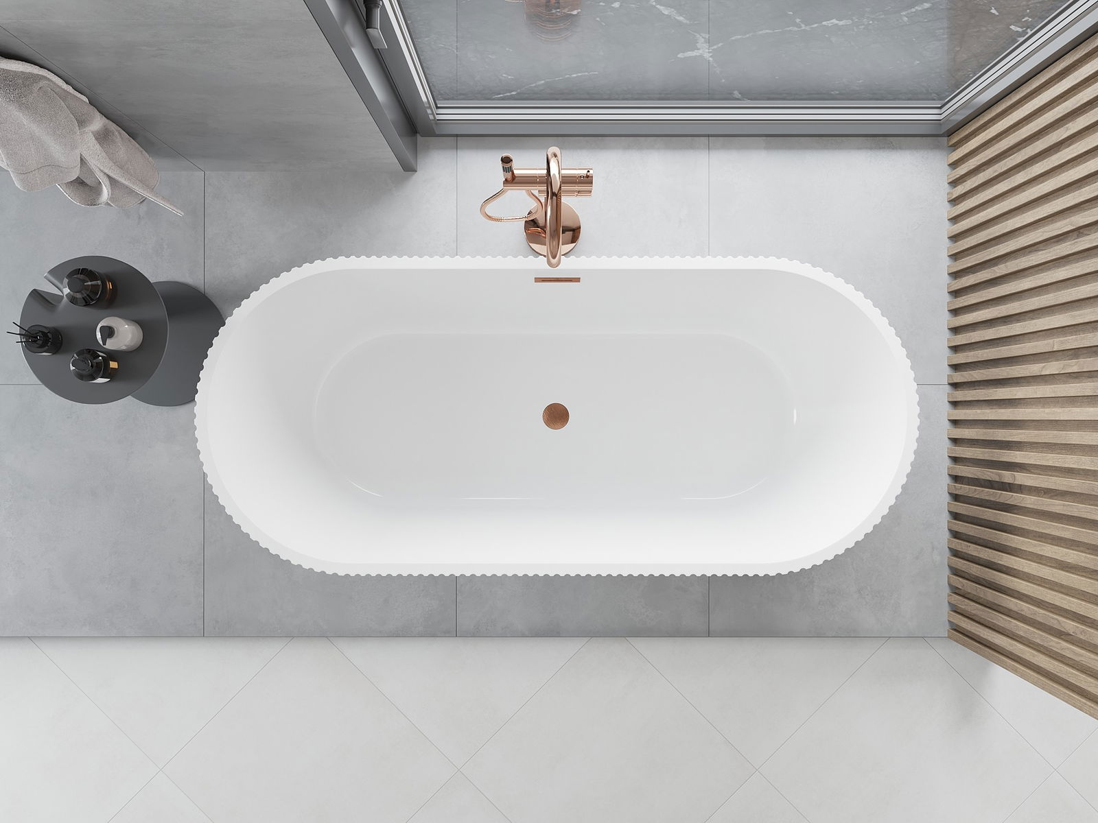 Tas ir mūsdienīgs materiāls, kas apvieno elegantu izskatu ar augstu izturību. Tas ir izturīgs pret mehāniskiem bojājumiem, viegli tīrāms un patīkams pieskārienam. Caurspīdīgā forma un plānais vannas malas dizains piešķir tai vieglumu un unikālu raksturu, radot iespaidīgu akcentu vannas istabas iekārtojumā.