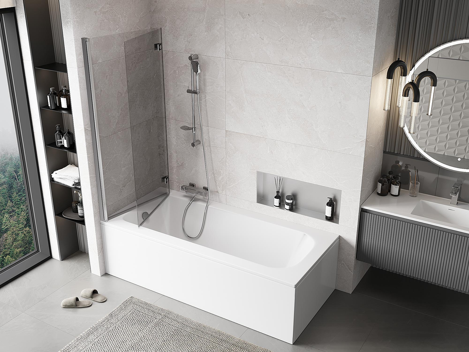 Efektīva aizsardzība pret ūdens izšļakstīšanos peldēšanās laikā. Ekrānam ir blīves, kas ideāli pielāgojas stikla virsmai un vannas malai. Funkcionāls risinājums, kas nodrošina drošību un vieglu tīrību.