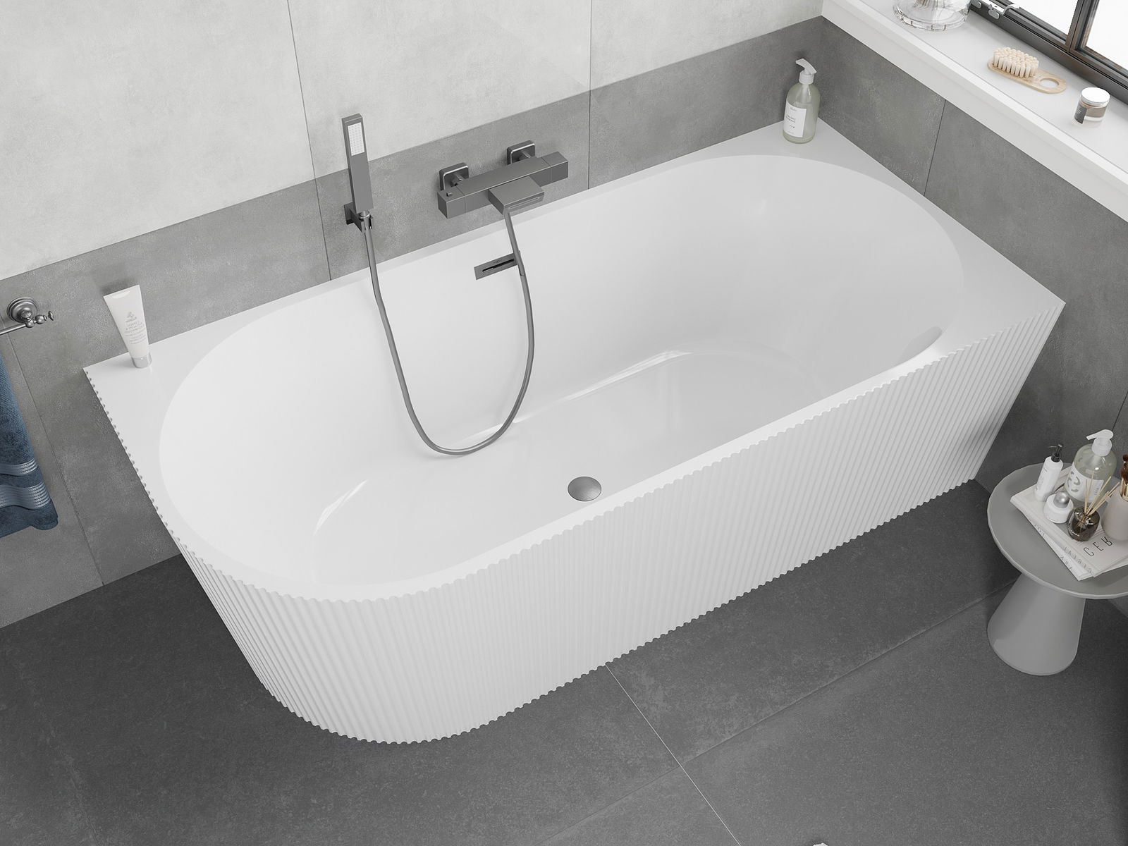 Mexen Silo brīvi stāvoša stūra vanna ar labās puses rievojumu 150 x 75 cm, balta, pārplūde matēti pelēka pulēta