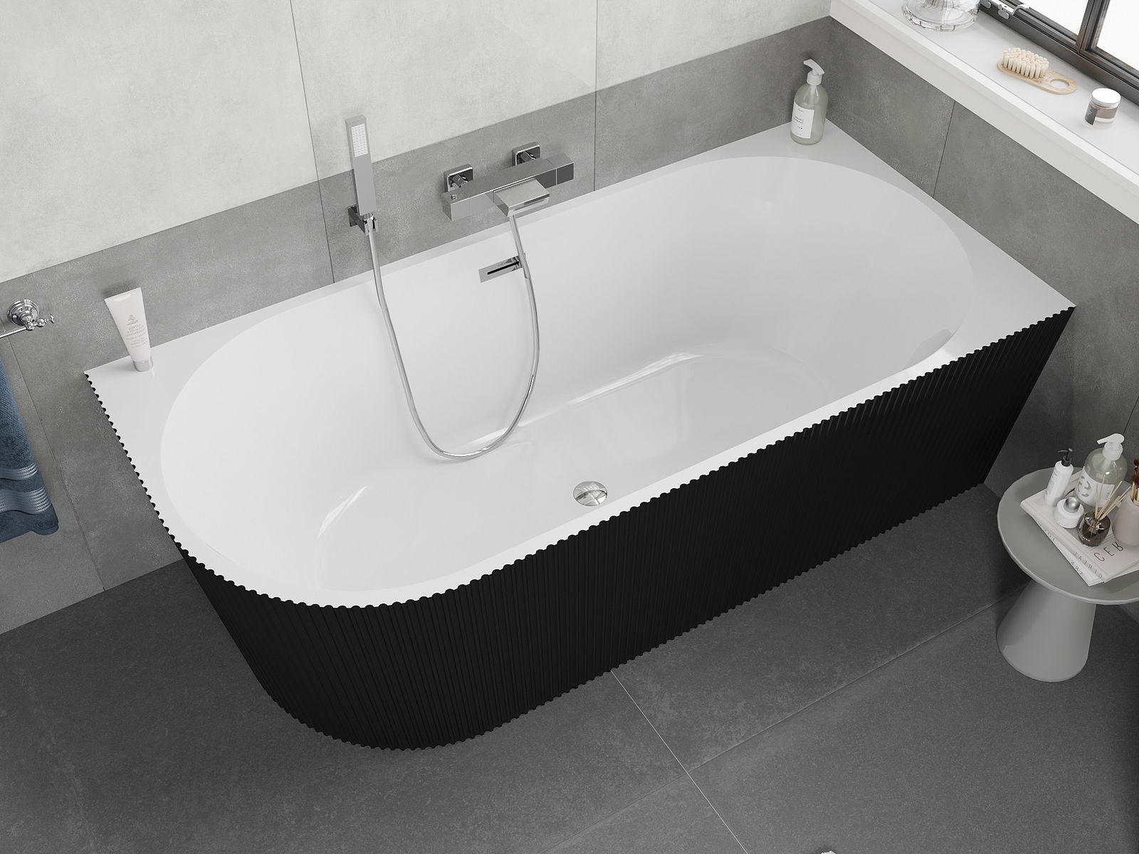 Mexen Silo brīvi stāvoša stūra vanna, labējā rievotā, 150 x 75 cm, balta/melna, pārplūde hromēta - 52891507575P-01