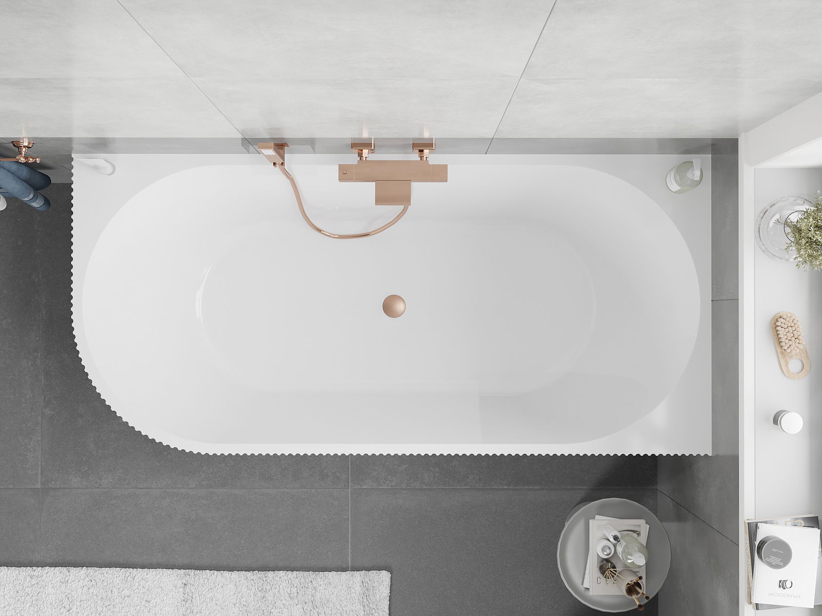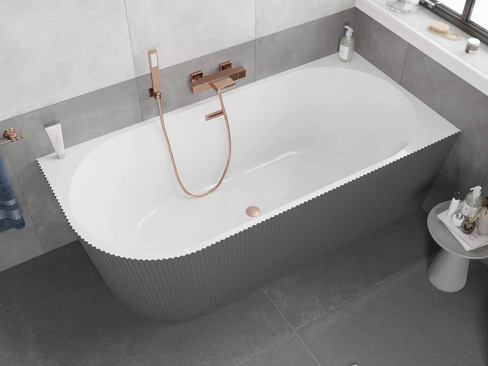 Mexen Silo Brīvi stāvoša stūra vanna labā rievojuma 150 x 75 cm, balta/pelēka, otu pieslaucās vara - 52891507562P-65