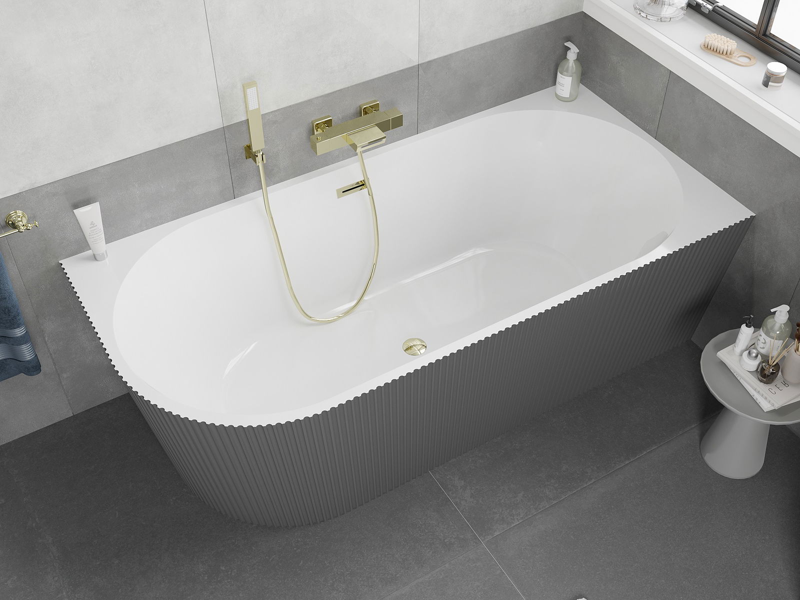 Mexen Silo brīvi stāvoša, stūra, labā uzsākuma, rievota vanna 170 x 80 cm, balta/pelēka, pārplūde zelta