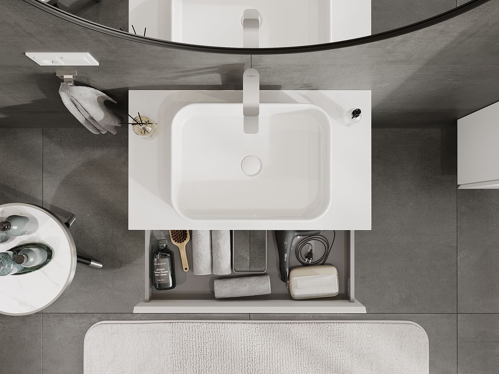 Izgriezums atvilktnē ir veidots tā, lai tajā varētu ietilpt sifons, kas ir nepieciešams izlietņu uzstādīšanā. Pateicoties tam, mēbele var tikt pilnībā funkcionāli uzstādīta, neatstājot ievērojamu vietu atvilktnē instalācijai.