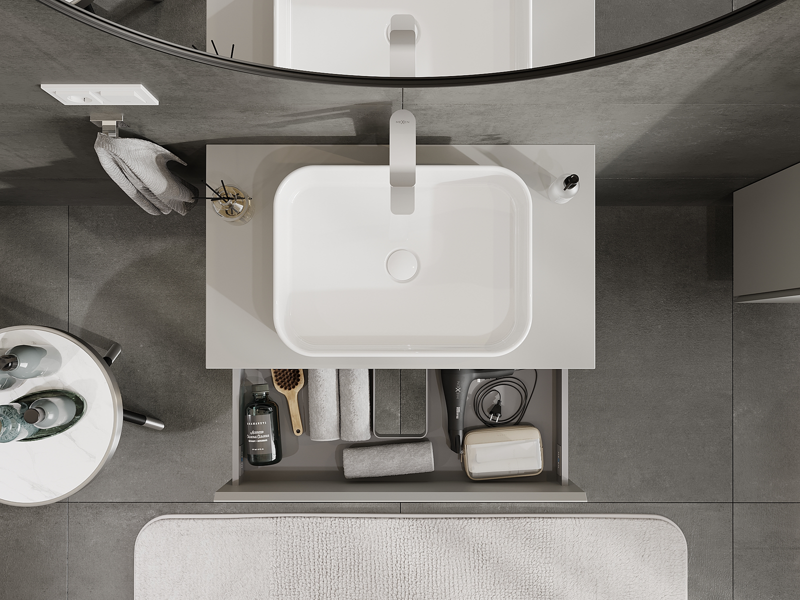 Izgriezums atvilktnē ir veidots tā, lai tajā varētu ietilpt sifons, kas ir nepieciešams izlietņu uzstādīšanā. Pateicoties tam, mēbele var tikt pilnībā funkcionāli uzstādīta, neatstājot ievērojamu vietu atvilktnē instalācijai.