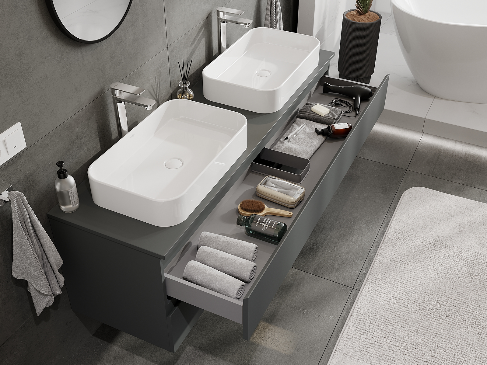 Mūsu modulārās vannas istabas mēbeles var savstarpēji kombinēt dažādās krāsu konfigurācijās, ļaujot pilnīgu personalizāciju. Var izvēlēties gan izskatu, gan atsevišķu elementu funkcijas, kas ļauj pielāgot mēbeles savām stilistiskajām un lietotāju vēlmēm.