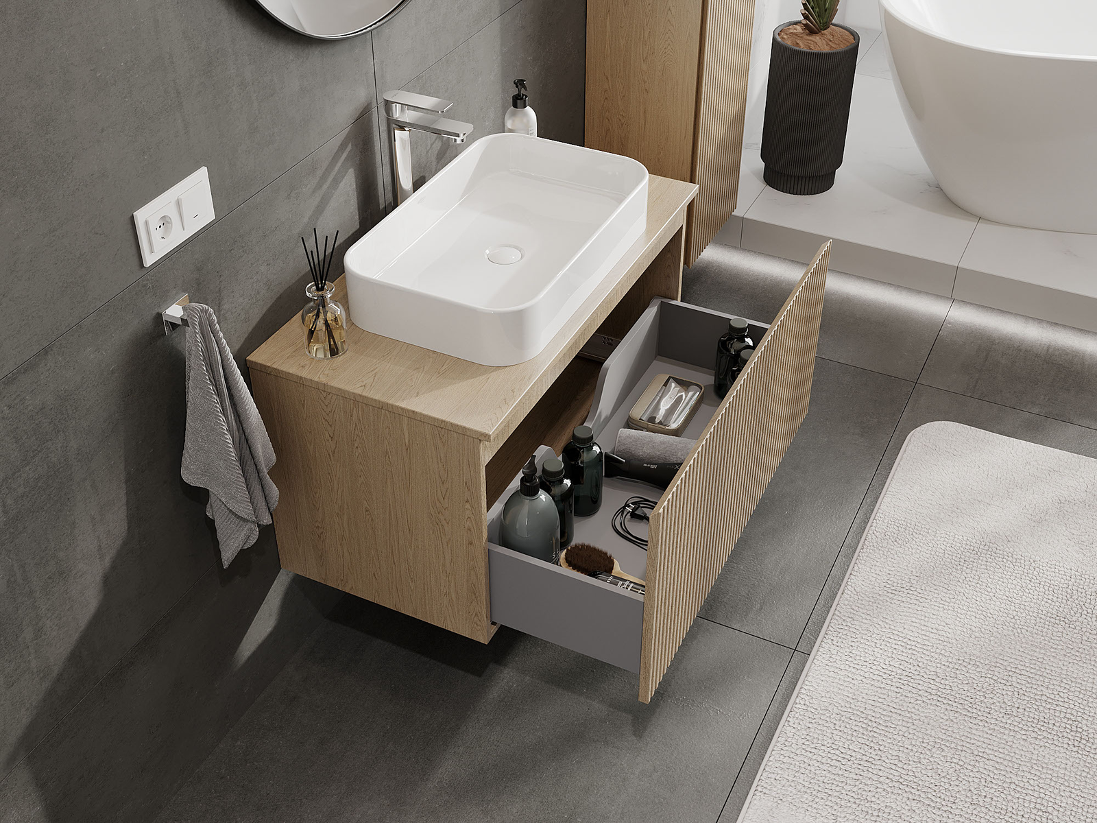 Mexen Rivel vannas istabas izlietnes skapītis 90 cm, 1 atvilktne, rievots, ozols - 91A20-09047-1-BF81