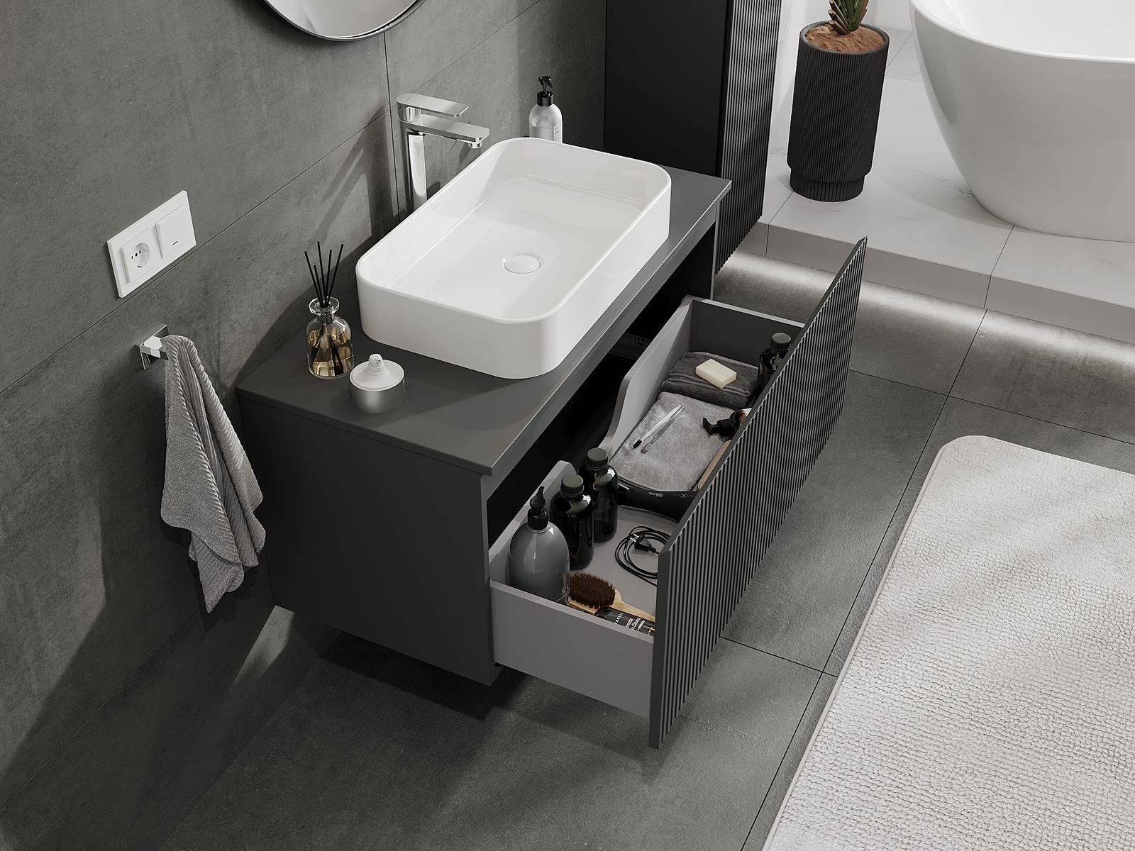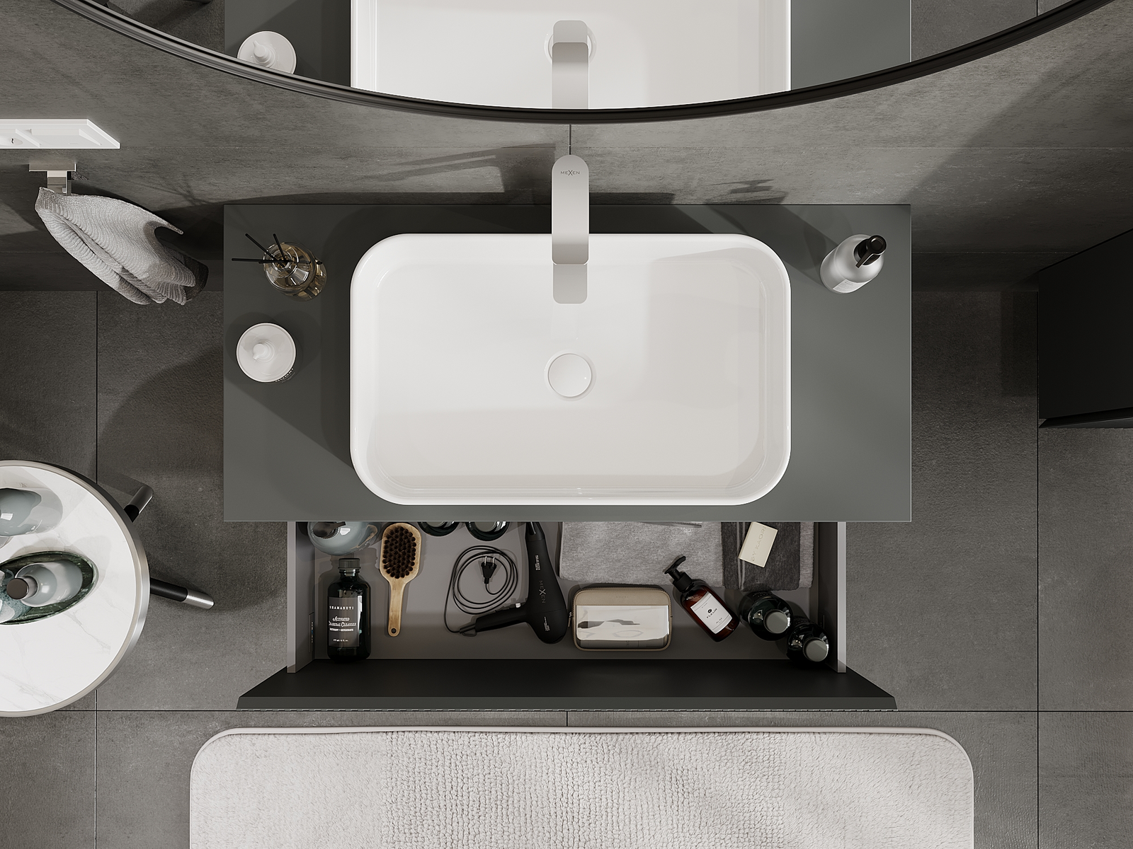 Izgriezums atvilktnē ir veidots tā, lai tajā varētu ietilpt sifons, kas ir nepieciešams izlietņu uzstādīšanā. Pateicoties tam, mēbele var tikt pilnībā funkcionāli uzstādīta, neatstājot ievērojamu vietu atvilktnē instalācijai.