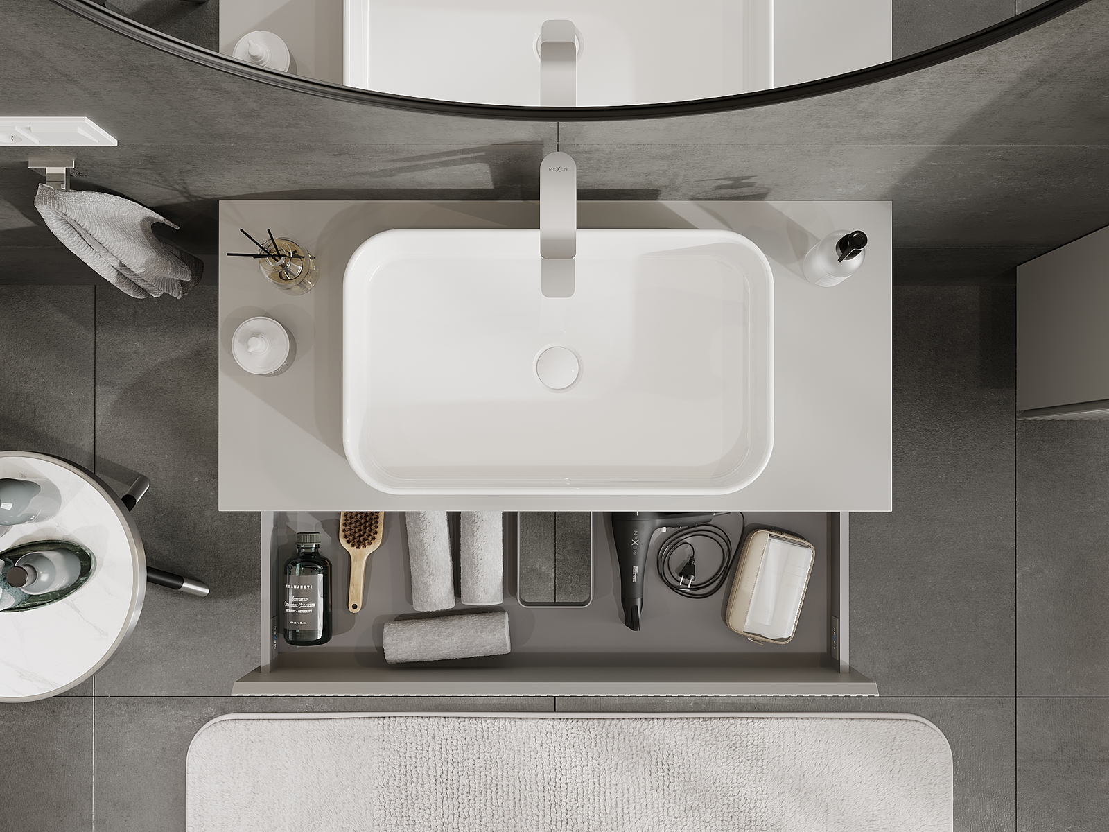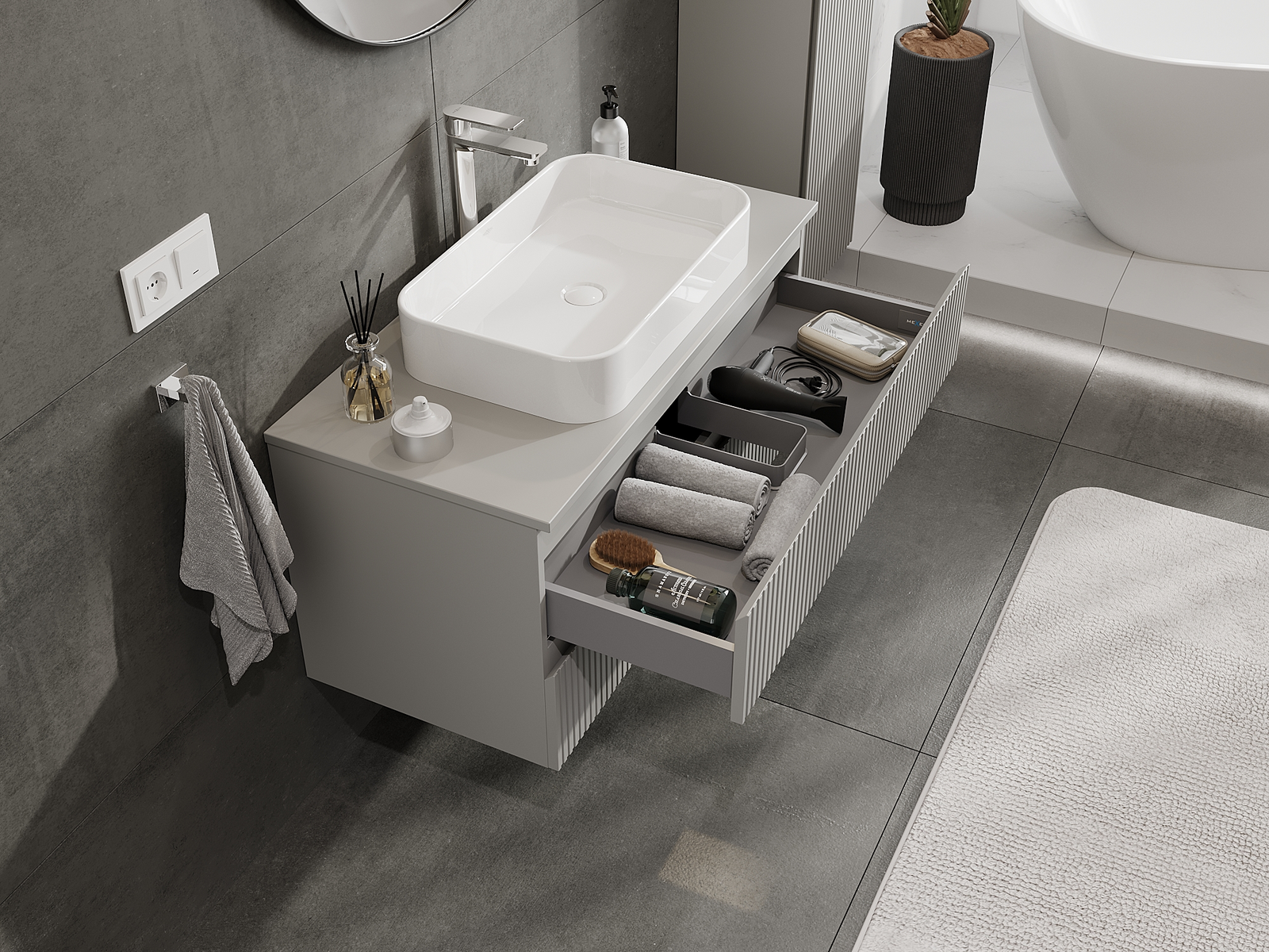 Izgriezums atvilktnē ir veidots tā, lai tajā varētu ietilpt sifons, kas ir nepieciešams izlietņu uzstādīšanā. Pateicoties tam, mēbele var tikt pilnībā funkcionāli uzstādīta, neatstājot ievērojamu vietu atvilktnē instalācijai.