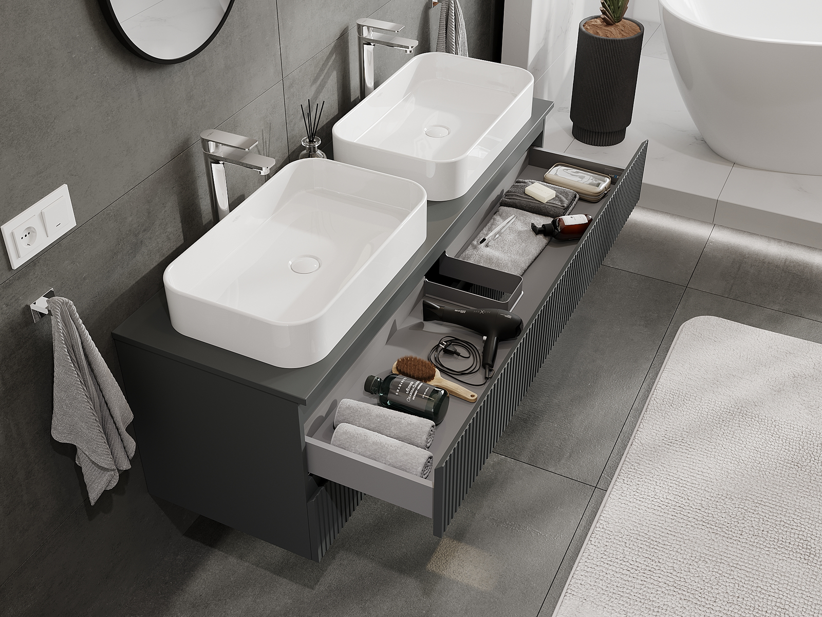 Mūsu modulārās vannas istabas mēbeles var savstarpēji kombinēt dažādās krāsu konfigurācijās, ļaujot pilnīgu personalizāciju. Var izvēlēties gan izskatu, gan atsevišķu elementu funkcijas, kas ļauj pielāgot mēbeles savām stilistiskajām un lietotāju vēlmēm.