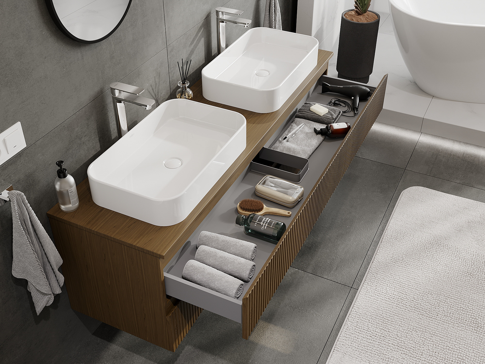 Mūsu modulārās vannas istabas mēbeles var savstarpēji kombinēt dažādās krāsu konfigurācijās, ļaujot pilnīgu personalizāciju. Var izvēlēties gan izskatu, gan atsevišķu elementu funkcijas, kas ļauj pielāgot mēbeles savām stilistiskajām un lietotāju vēlmēm.