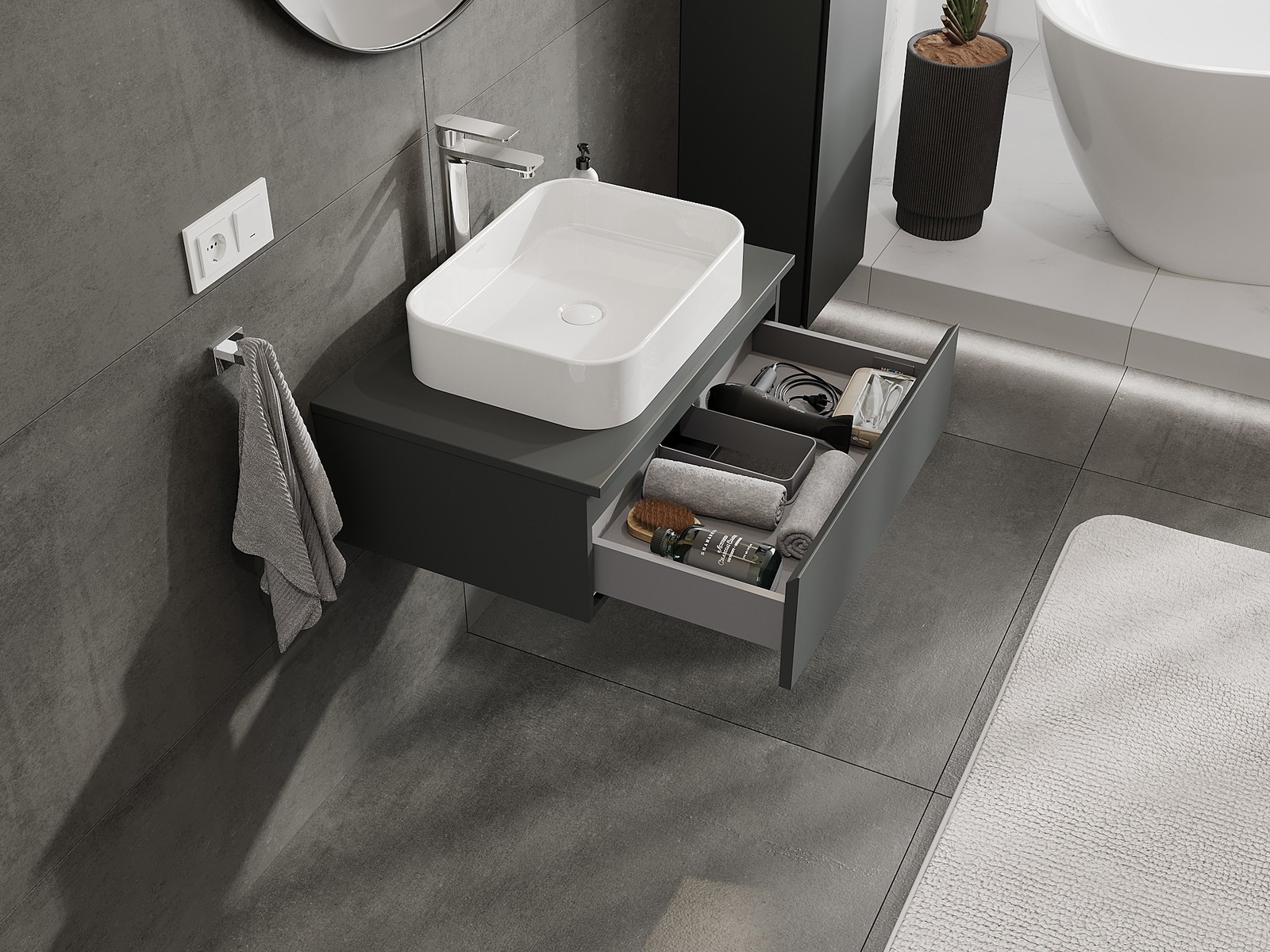 Izgriezums atvilktnē ir veidots tā, lai tajā varētu ietilpt sifons, kas ir nepieciešams izlietņu uzstādīšanā. Pateicoties tam, mēbele var tikt pilnībā funkcionāli uzstādīta, neatstājot ievērojamu vietu atvilktnē instalācijai.