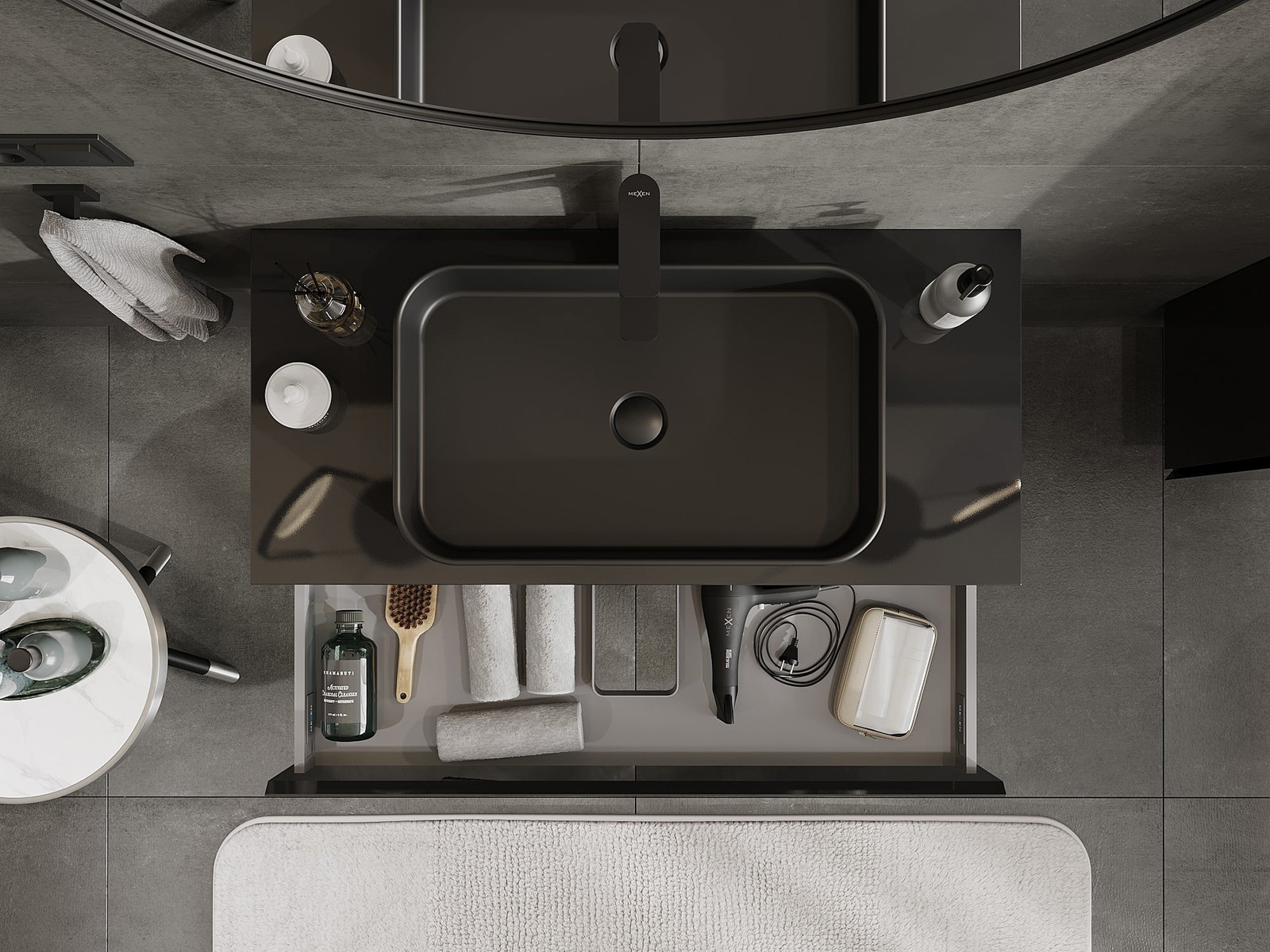 Mexen Orio vannas istabas skapītis zem izlietnes 100 cm ar galda virsmu, 1 atvilktne, melns spīdums - 91A10-10023-1-BFC70