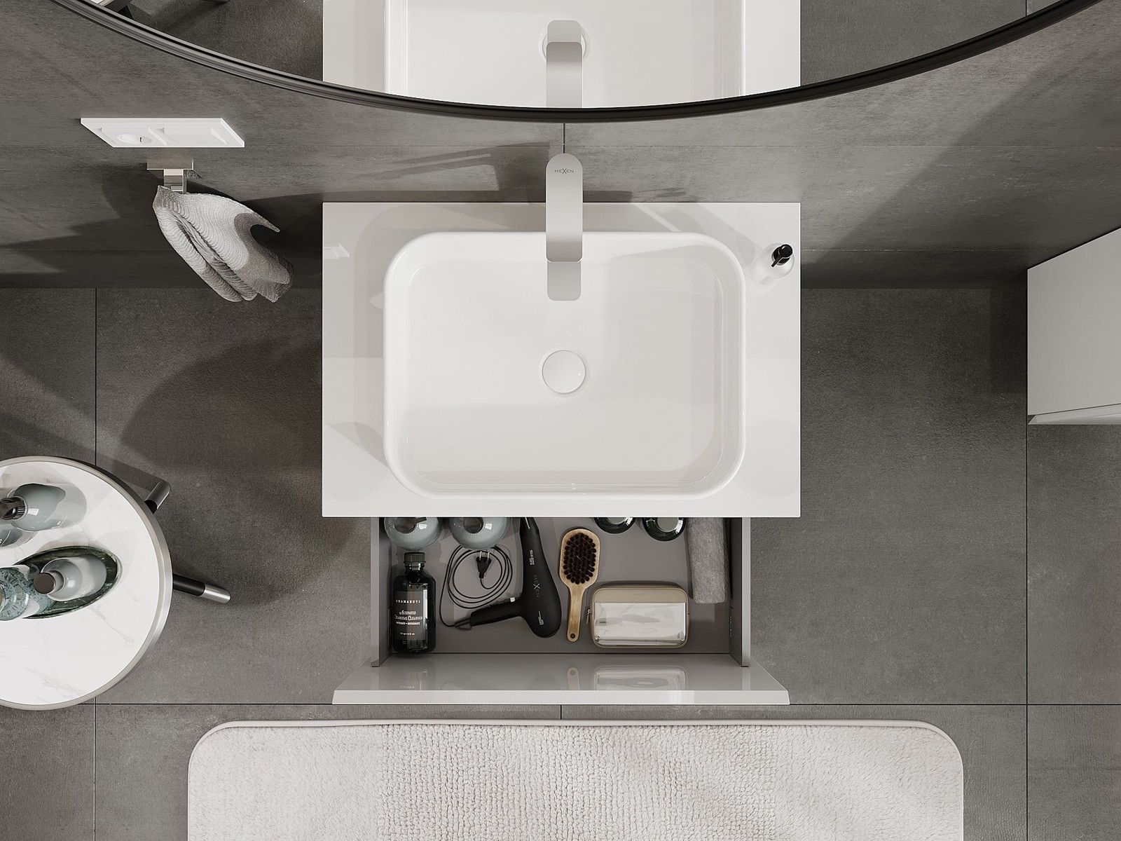 Izgriezums atvilktnē ir veidots tā, lai tajā varētu ietilpt sifons, kas ir nepieciešams izlietņu uzstādīšanā. Pateicoties tam, mēbele var tikt pilnībā funkcionāli uzstādīta, neatstājot ievērojamu vietu atvilktnē instalācijai.