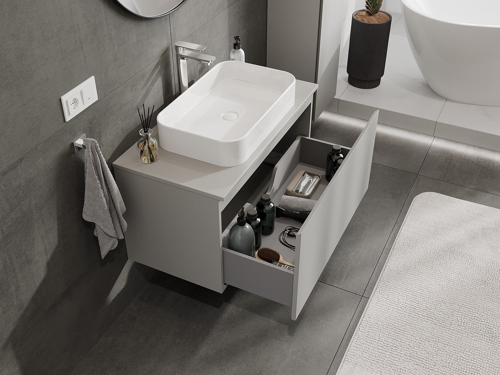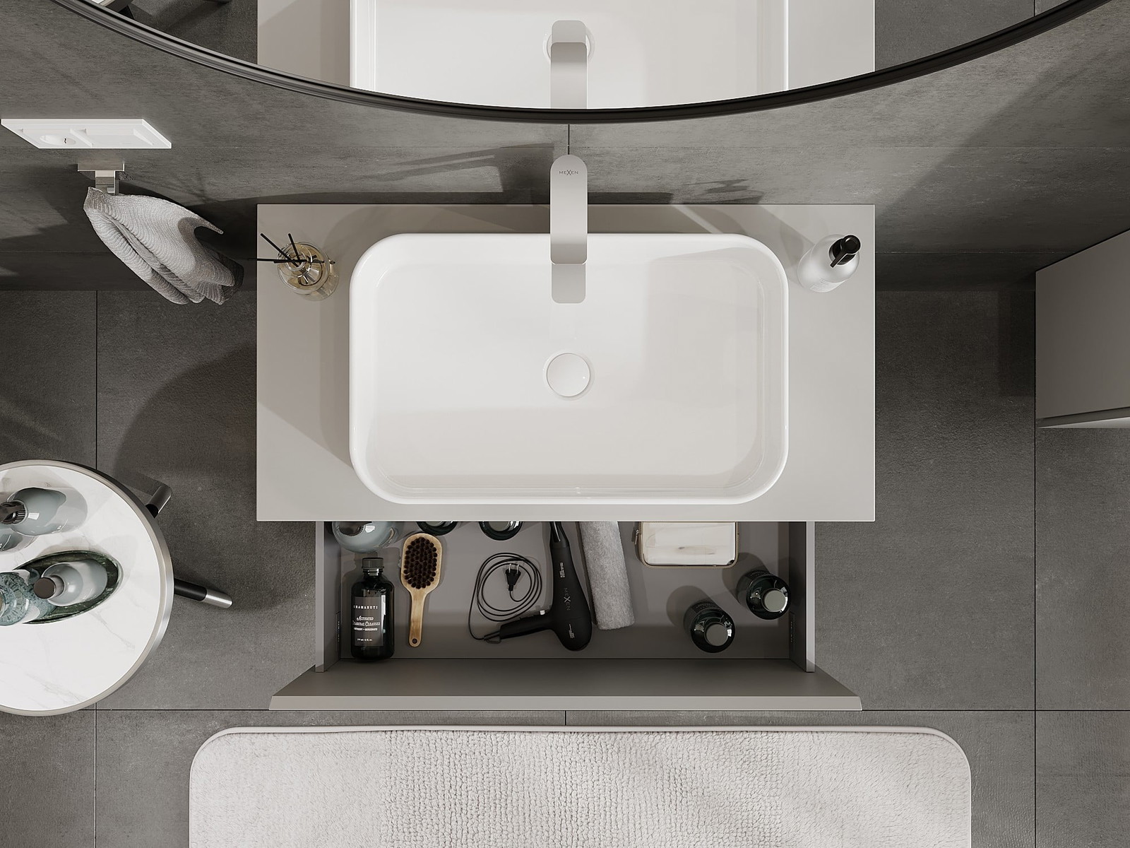Izgriezums atvilktnē ir veidots tā, lai tajā varētu ietilpt sifons, kas ir nepieciešams izlietņu uzstādīšanā. Pateicoties tam, mēbele var tikt pilnībā funkcionāli uzstādīta, neatstājot ievērojamu vietu atvilktnē instalācijai.