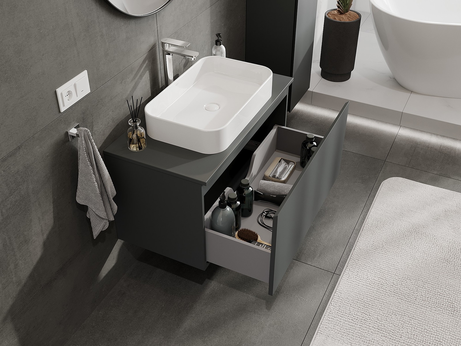 Izgriezums atvilktnē ir veidots tā, lai tajā varētu ietilpt sifons, kas ir nepieciešams izlietņu uzstādīšanā. Pateicoties tam, mēbele var tikt pilnībā funkcionāli uzstādīta, neatstājot ievērojamu vietu atvilktnē instalācijai.