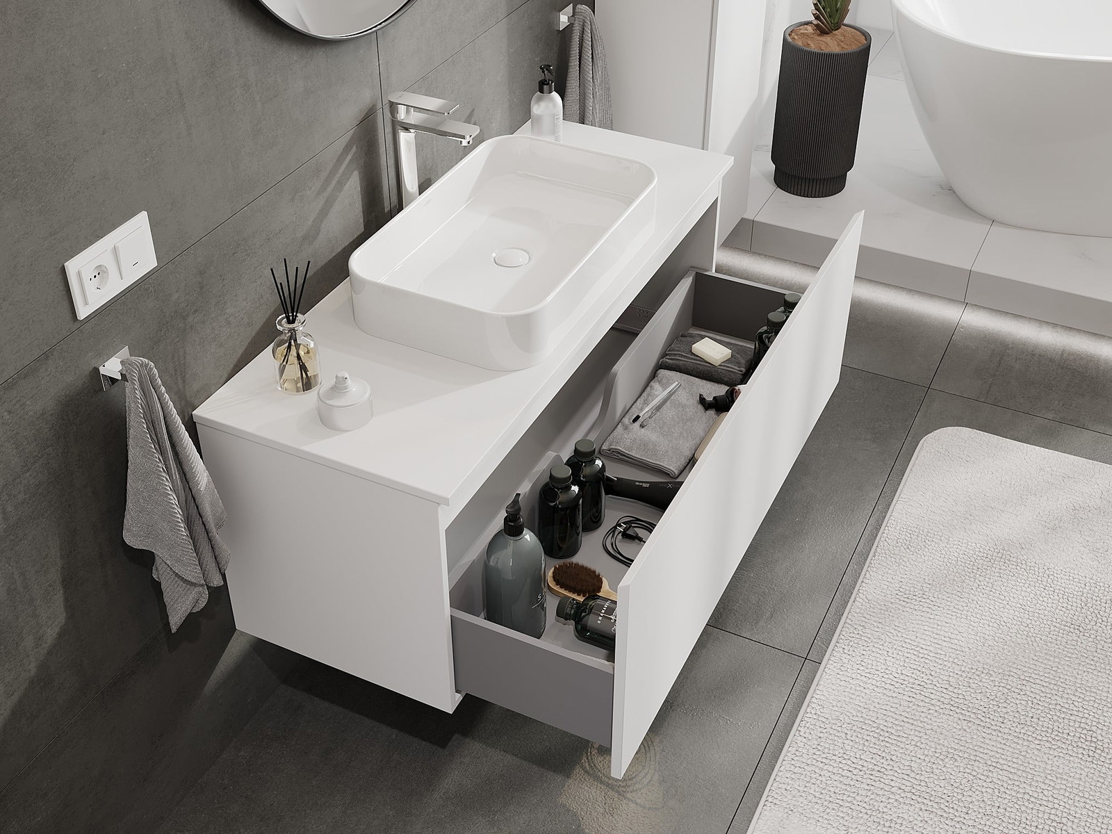 Izgriezums atvilktnē ir veidots tā, lai tajā varētu ietilpt sifons, kas ir nepieciešams izlietņu uzstādīšanā. Pateicoties tam, mēbele var tikt pilnībā funkcionāli uzstādīta, neatstājot ievērojamu vietu atvilktnē instalācijai.