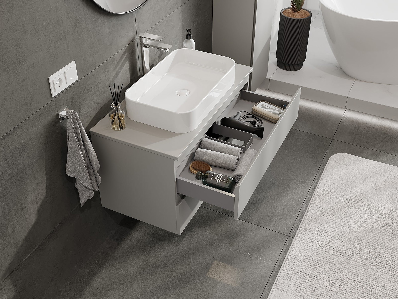 Mūsu modulārās vannas istabas mēbeles var savstarpēji kombinēt dažādās krāsu konfigurācijās, ļaujot pilnīgu personalizāciju. Var izvēlēties gan izskatu, gan atsevišķu elementu funkcijas, kas ļauj pielāgot mēbeles savām stilistiskajām un lietotāju vēlmēm.
