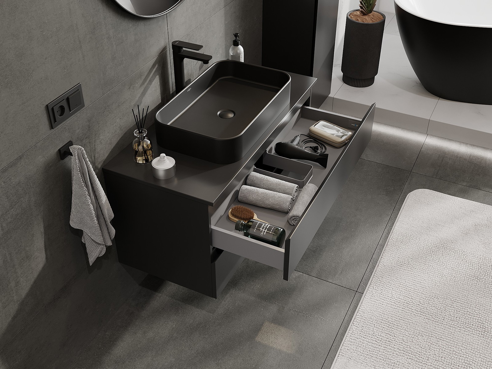 Izgriezums atvilktnē ir veidots tā, lai tajā varētu ietilpt sifons, kas ir nepieciešams izlietņu uzstādīšanā. Pateicoties tam, mēbele var tikt pilnībā funkcionāli uzstādīta, neatstājot ievērojamu vietu atvilktnē instalācijai.