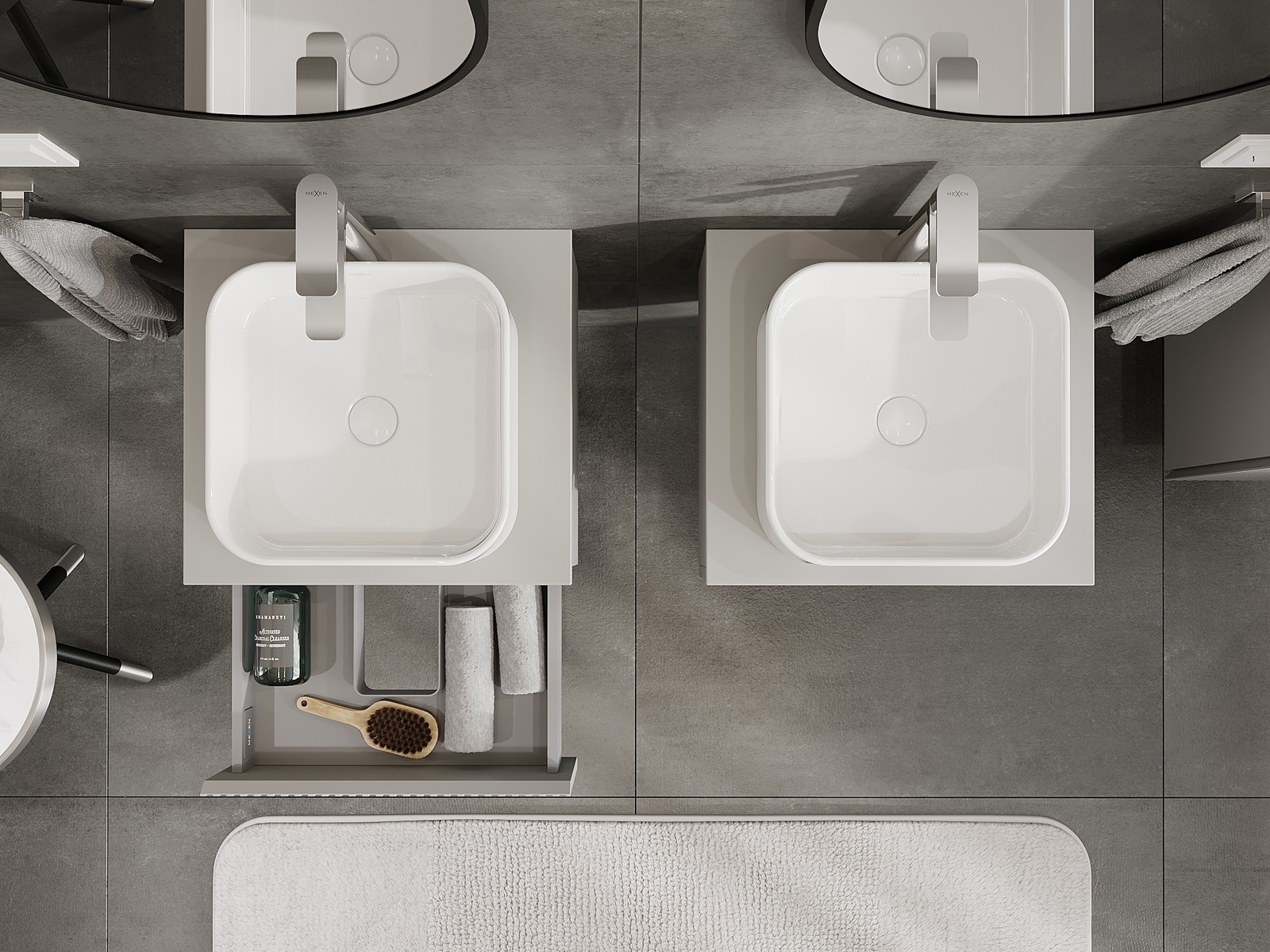 Mūsu modulārās vannas istabas mēbeles var savstarpēji kombinēt dažādās krāsu konfigurācijās, ļaujot pilnīgu personalizāciju. Var izvēlēties gan izskatu, gan atsevišķu elementu funkcijas, kas ļauj pielāgot mēbeles savām stilistiskajām un lietotāju vēlmēm.
