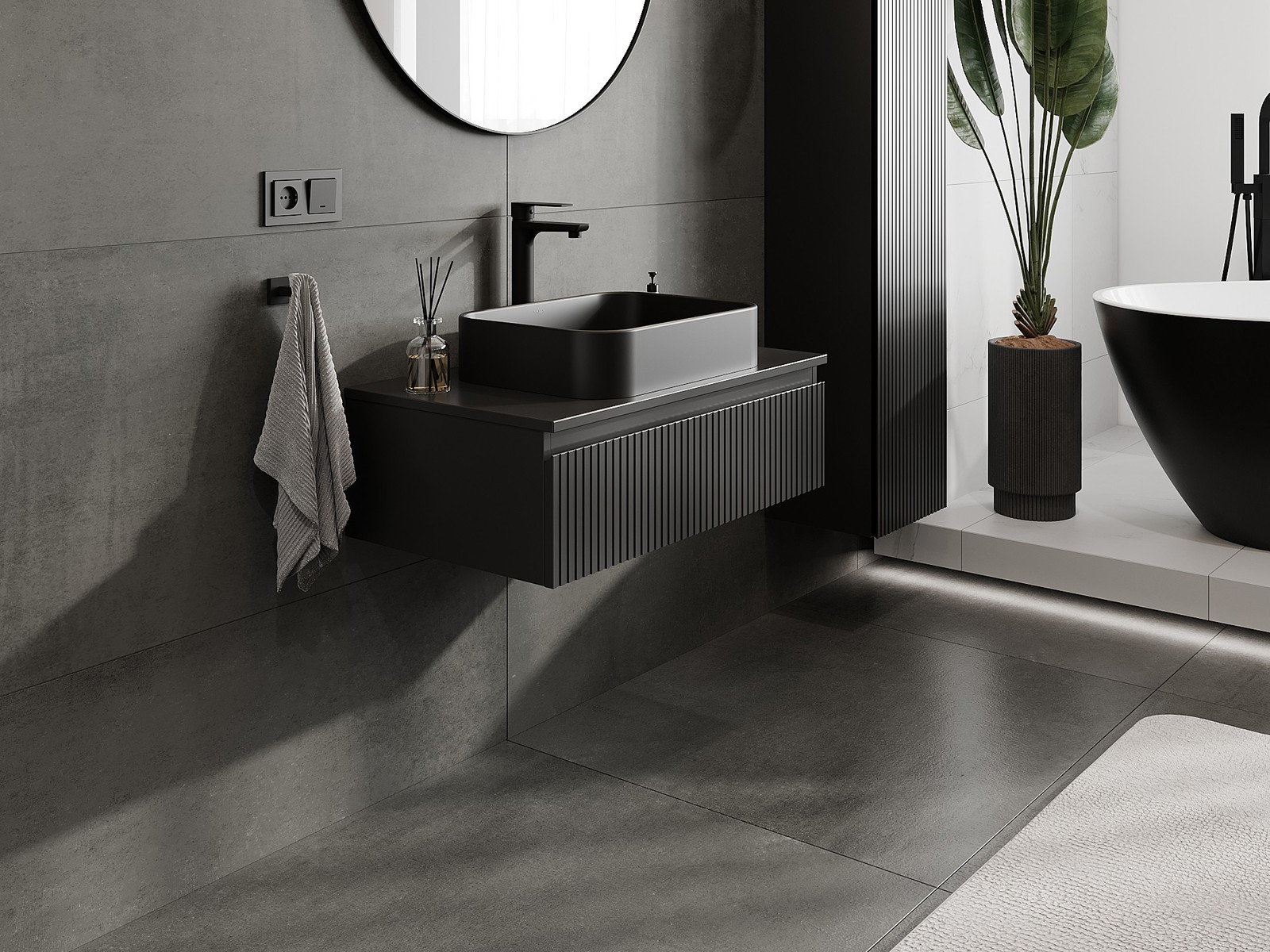 Mexen Rivel vannas istabas izlietnes skapītis 80 cm ar virsmu, 1 atvilktne, rievots, melns matēts - 91A20-08023-1-BFC71