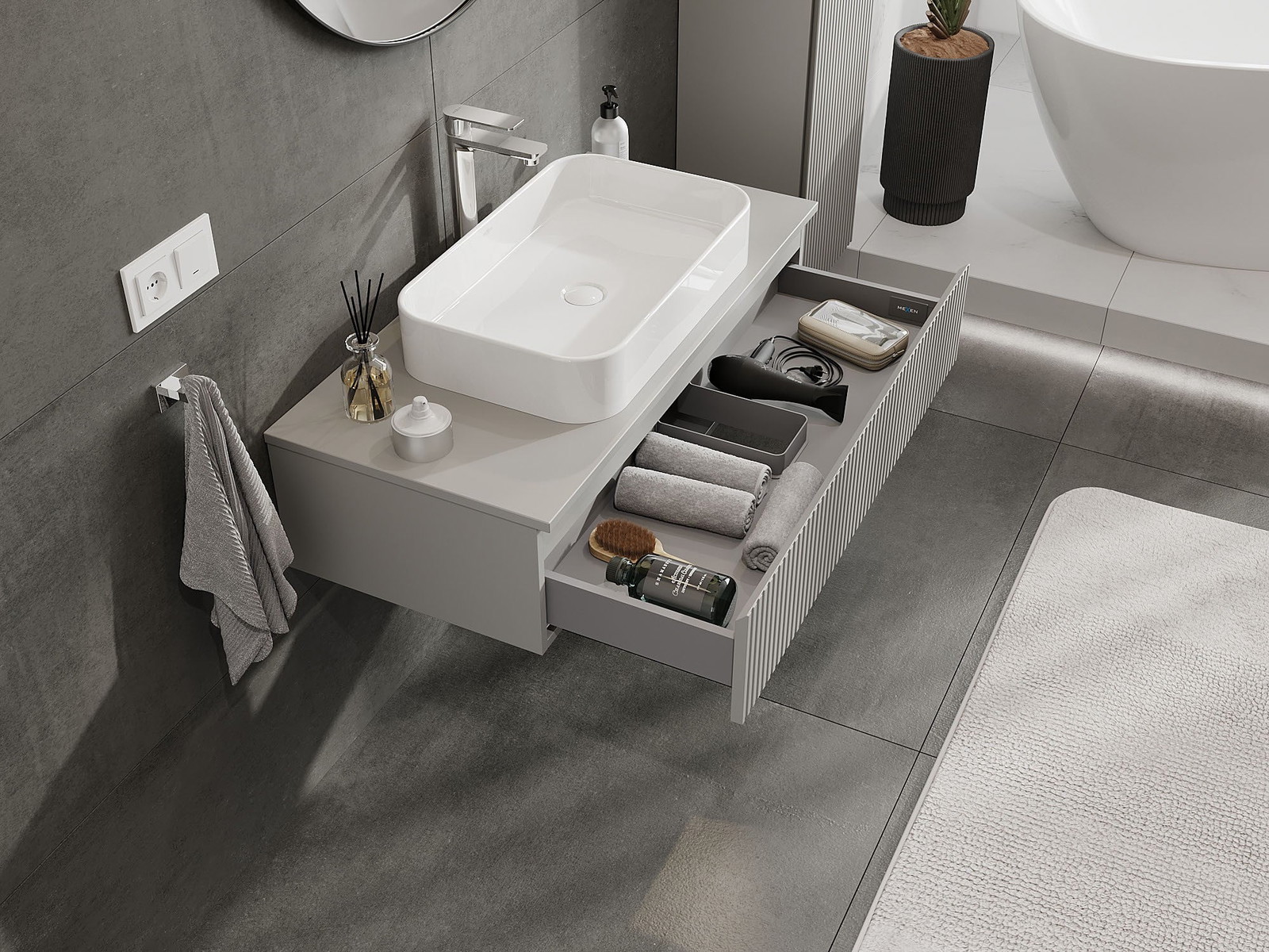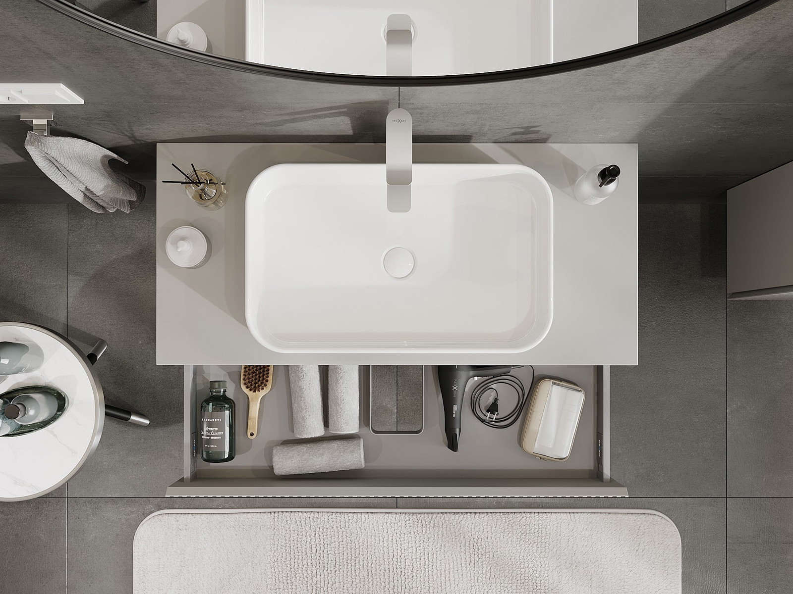 Izgriezums atvilktnē ir veidots tā, lai tajā varētu ietilpt sifons, kas ir nepieciešams izlietņu uzstādīšanā. Pateicoties tam, mēbele var tikt pilnībā funkcionāli uzstādīta, neatstājot ievērojamu vietu atvilktnē instalācijai.