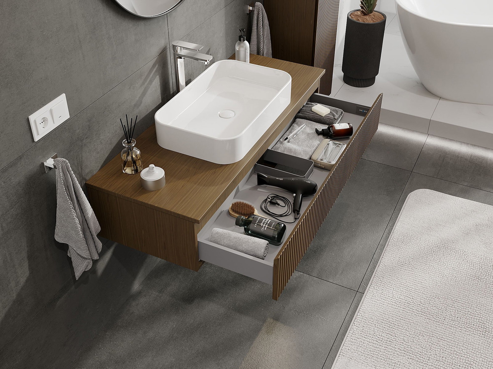 Mexen Rivel vannas istabas skapis zem izlietnes 120 cm ar galdu, 1 atvilktne, rievota, valriekstu - 91A20-12023-1-BFC86