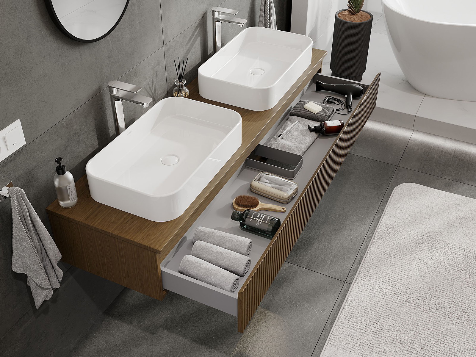 Izgriezums atvilktnē ir veidots tā, lai tajā varētu ietilpt sifons, kas ir nepieciešams izlietņu uzstādīšanā. Pateicoties tam, mēbele var tikt pilnībā funkcionāli uzstādīta, neatstājot ievērojamu vietu atvilktnē instalācijai.