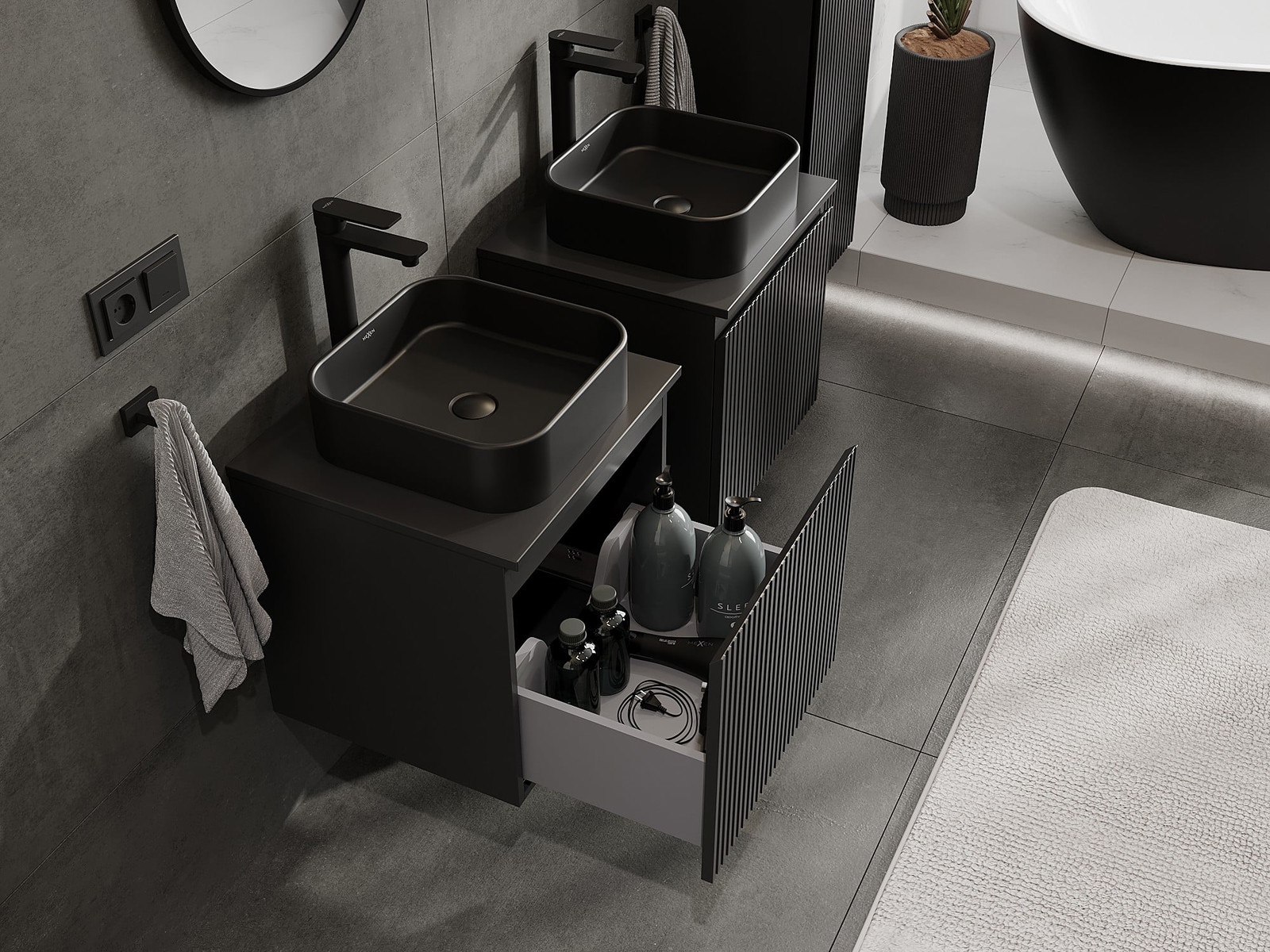 Mexen Rivel vannas istabas skapis zem izlietnes 50 cm ar galda virsmu, 1 atvilktne, rievots, melns mats - 91A20-05047-1-BFC71