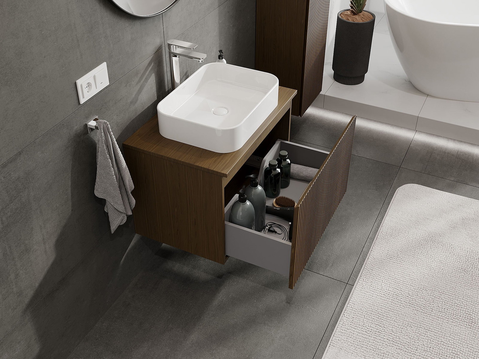 Izgriezums atvilktnē ir veidots tā, lai tajā varētu ietilpt sifons, kas ir nepieciešams izlietņu uzstādīšanā. Pateicoties tam, mēbele var tikt pilnībā funkcionāli uzstādīta, neatstājot ievērojamu vietu atvilktnē instalācijai.