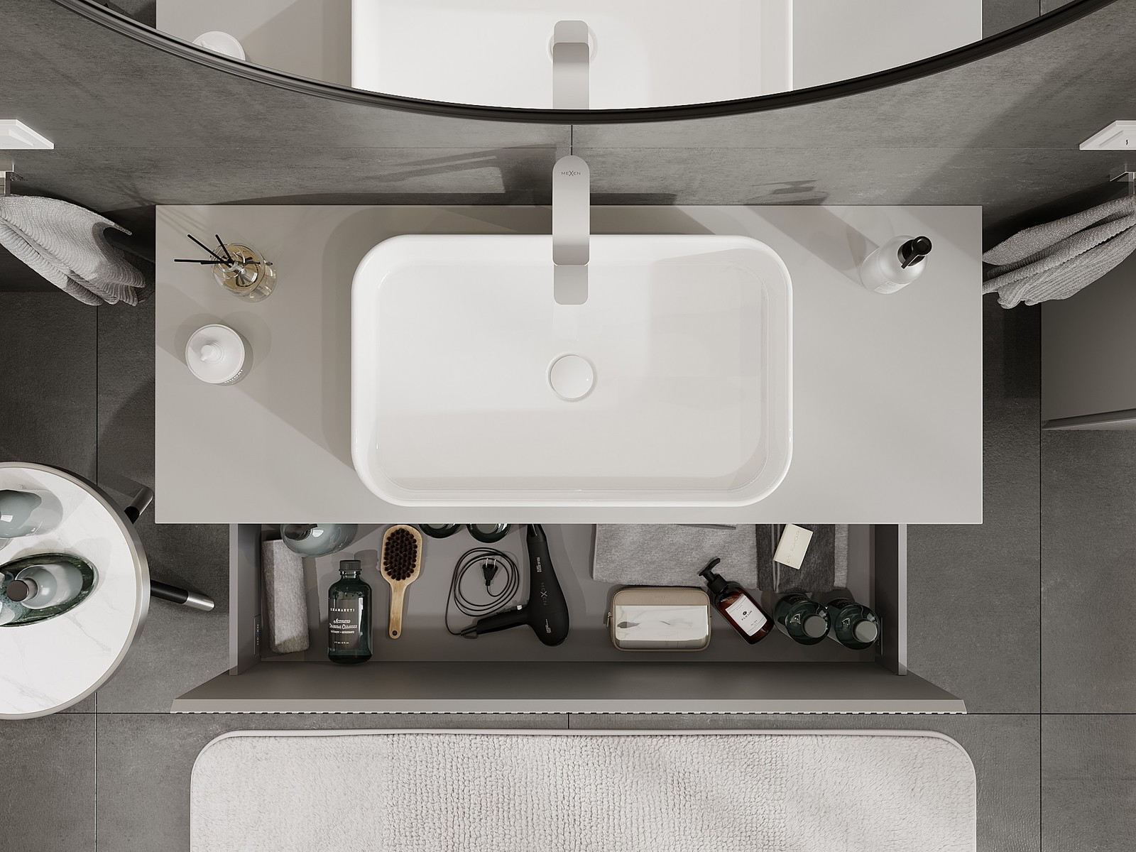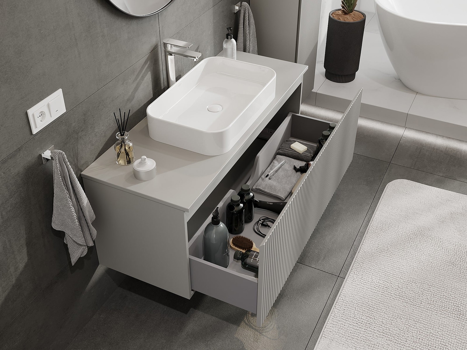 Izgriezums atvilktnē ir veidots tā, lai tajā varētu ietilpt sifons, kas ir nepieciešams izlietņu uzstādīšanā. Pateicoties tam, mēbele var tikt pilnībā funkcionāli uzstādīta, neatstājot ievērojamu vietu atvilktnē instalācijai.