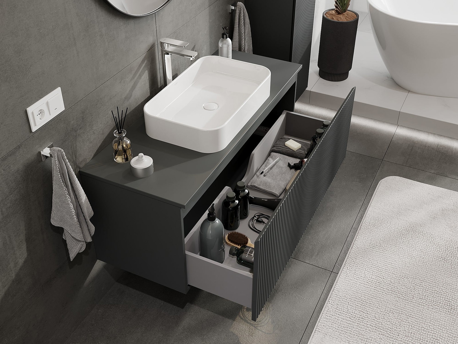 Mexen Rivel vannas istabas izlietnes skapis 120 cm ar virsmu, 1 atvilktne, rievots, matēts grafīts - 91A20-12047-1-BFC66