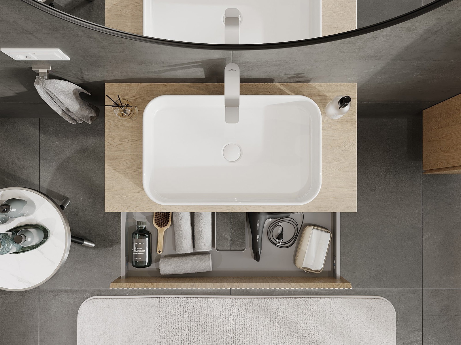 Izgriezums atvilktnē ir veidots tā, lai tajā varētu ietilpt sifons, kas ir nepieciešams izlietņu uzstādīšanā. Pateicoties tam, mēbele var tikt pilnībā funkcionāli uzstādīta, neatstājot ievērojamu vietu atvilktnē instalācijai.