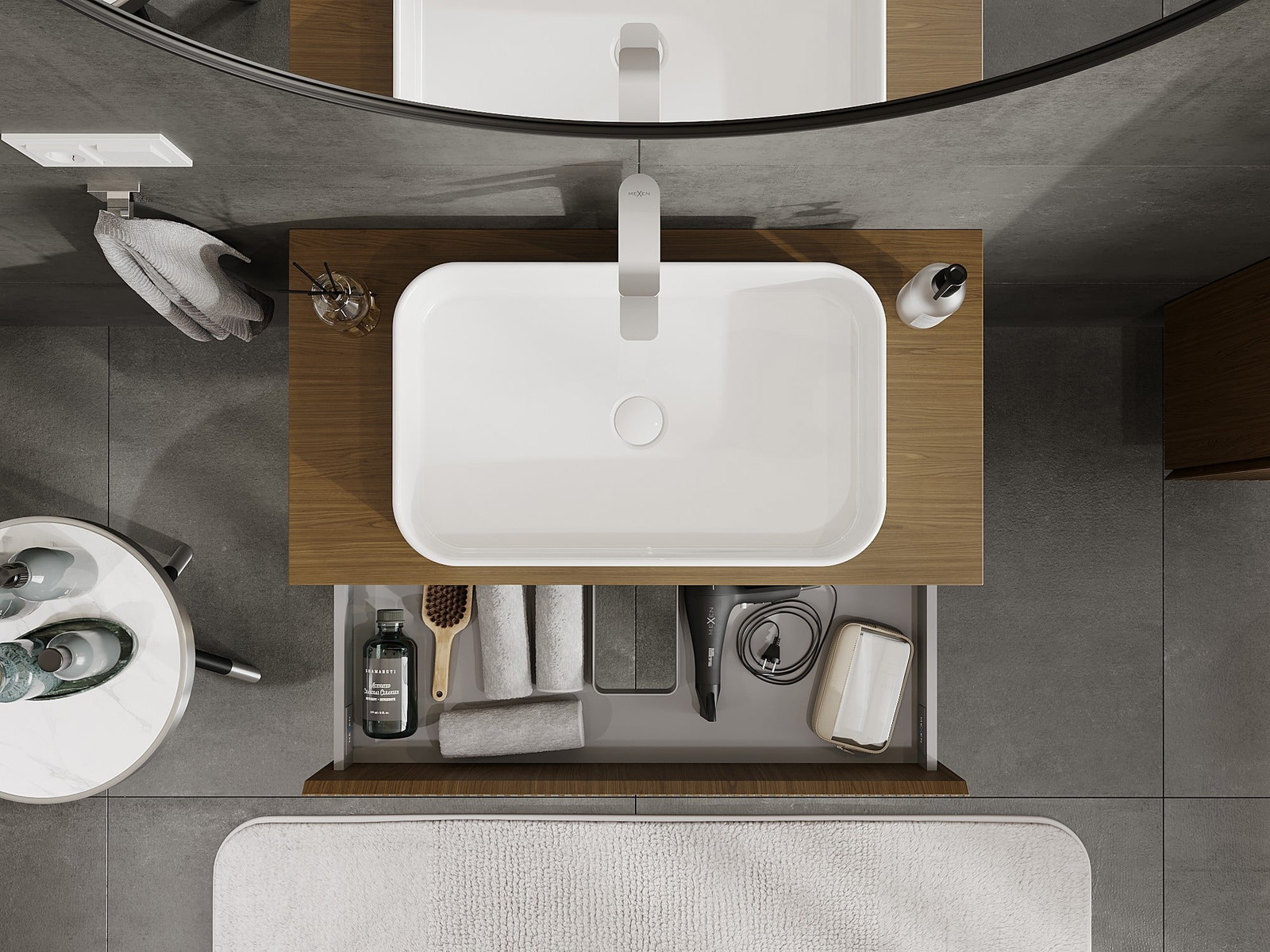 Izgriezums atvilktnē ir veidots tā, lai tajā varētu ietilpt sifons, kas ir nepieciešams izlietņu uzstādīšanā. Pateicoties tam, mēbele var tikt pilnībā funkcionāli uzstādīta, neatstājot ievērojamu vietu atvilktnē instalācijai.