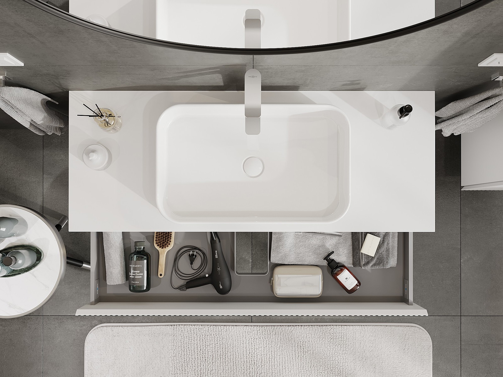 Izgriezums atvilktnē ir veidots tā, lai tajā varētu ietilpt sifons, kas ir nepieciešams izlietņu uzstādīšanā. Pateicoties tam, mēbele var tikt pilnībā funkcionāli uzstādīta, neatstājot ievērojamu vietu atvilktnē instalācijai.