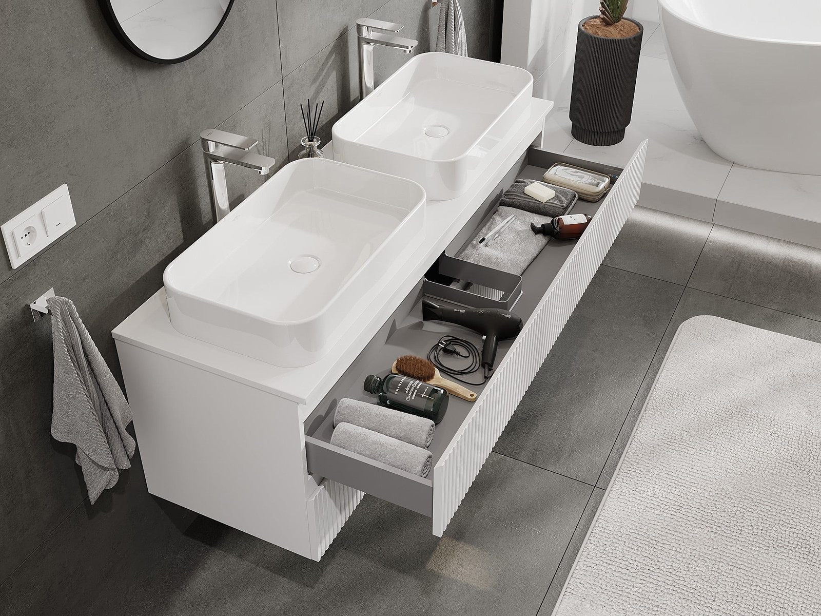 Izgriezums atvilktnē ir veidots tā, lai tajā varētu ietilpt sifons, kas ir nepieciešams izlietņu uzstādīšanā. Pateicoties tam, mēbele var tikt pilnībā funkcionāli uzstādīta, neatstājot ievērojamu vietu atvilktnē instalācijai.