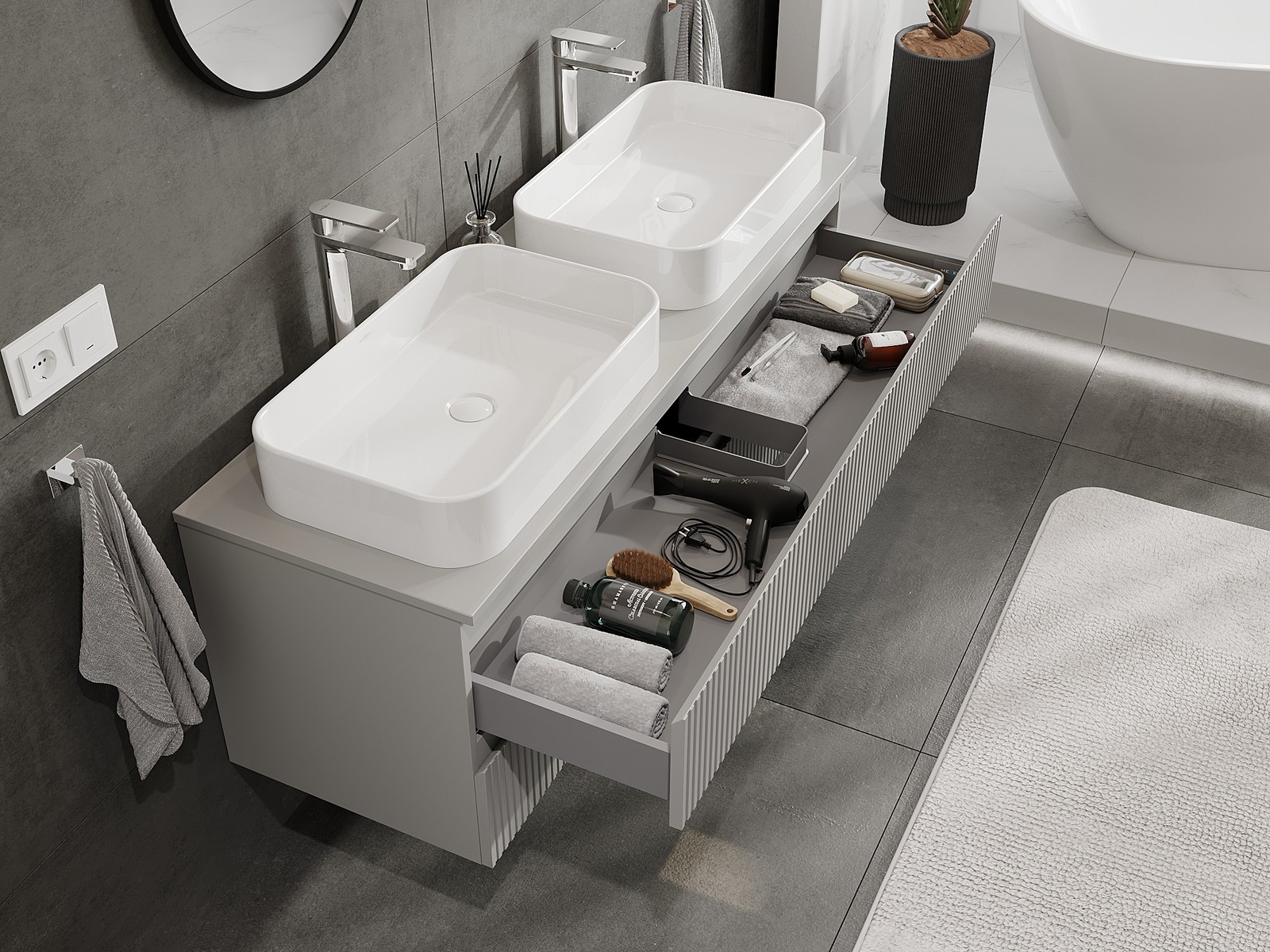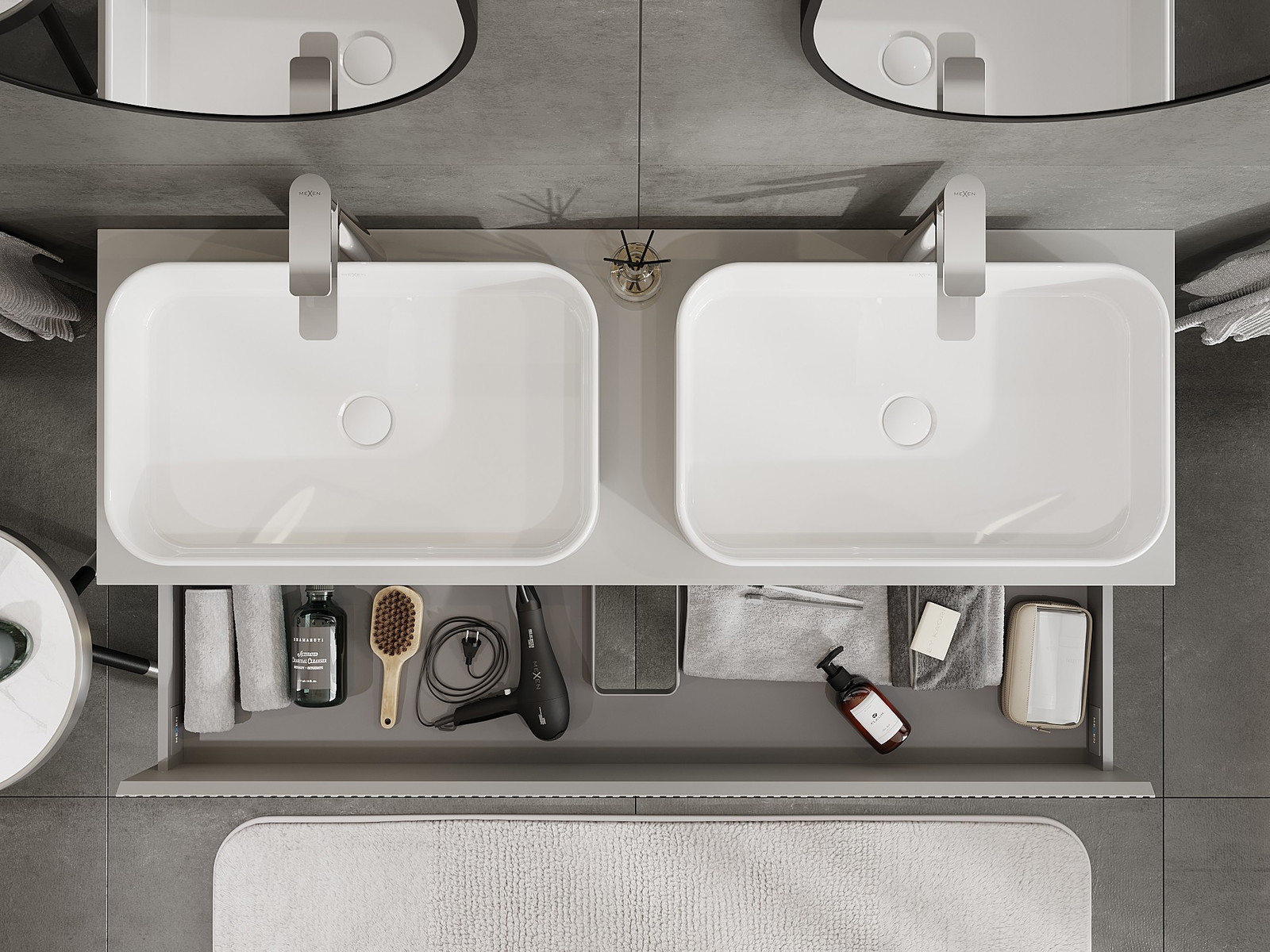 Izgriezums atvilktnē ir veidots tā, lai tajā varētu ietilpt sifons, kas ir nepieciešams izlietņu uzstādīšanā. Pateicoties tam, mēbele var tikt pilnībā funkcionāli uzstādīta, neatstājot ievērojamu vietu atvilktnē instalācijai.