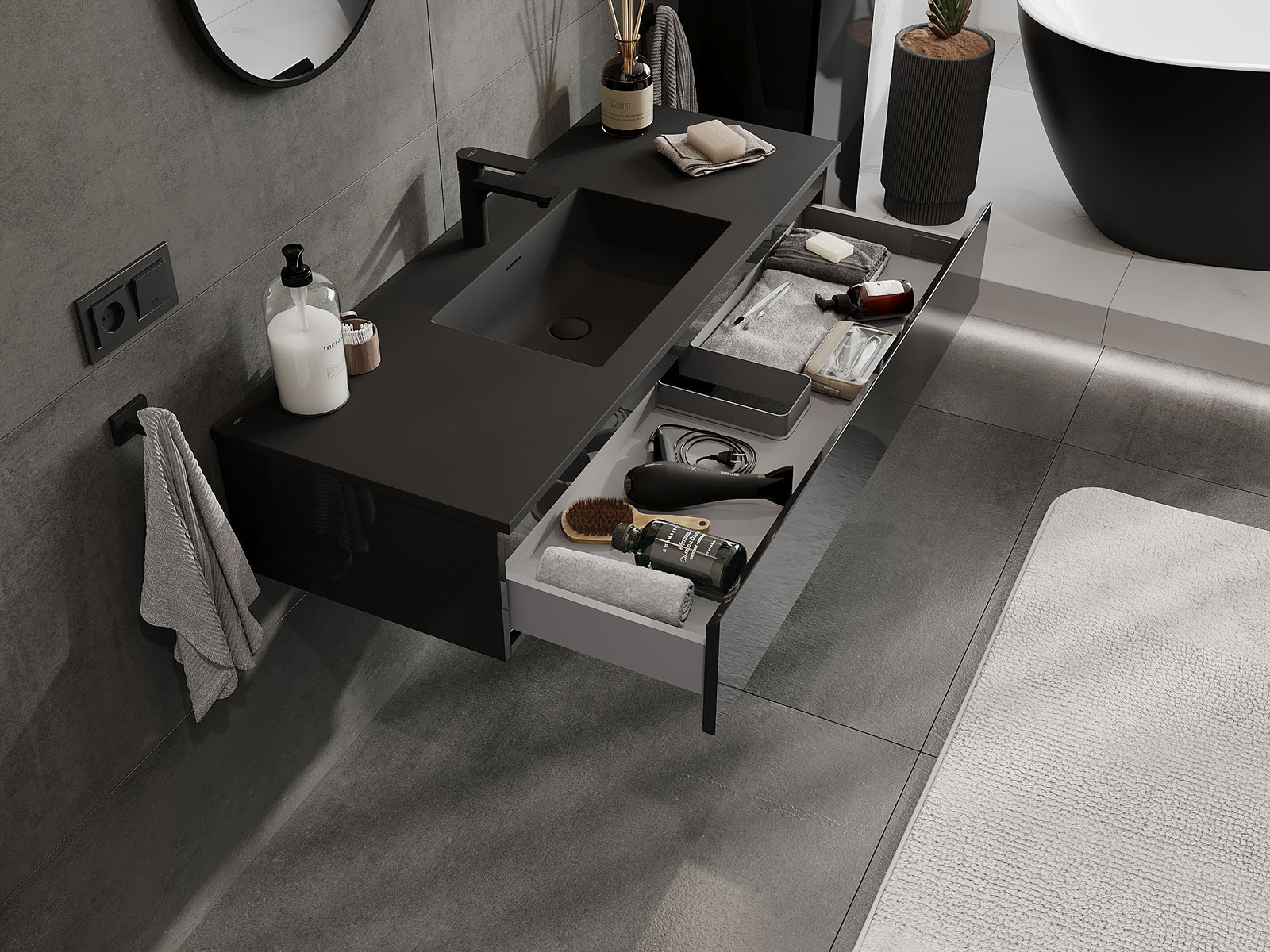Izgriezums atvilktnē ir veidots tā, lai tajā varētu ietilpt sifons, kas ir nepieciešams izlietņu uzstādīšanā. Pateicoties tam, mēbele var tikt pilnībā funkcionāli uzstādīta, neatstājot ievērojamu vietu atvilktnē instalācijai.