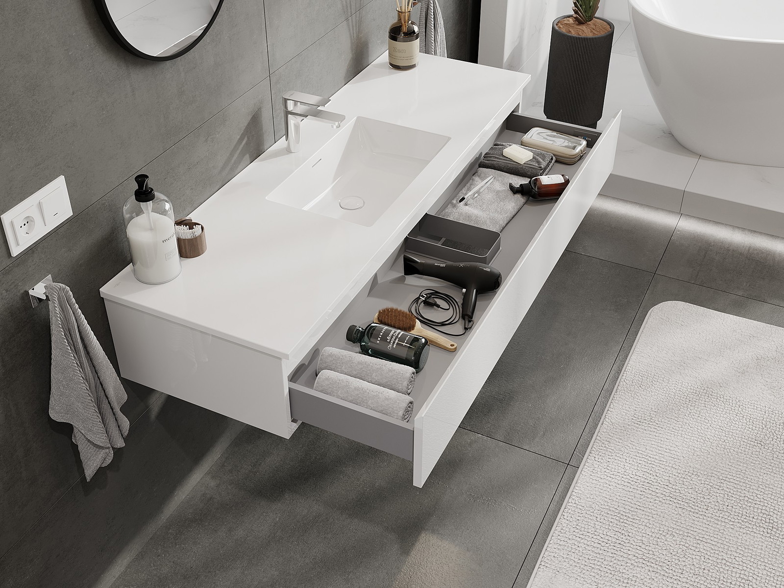 Izgriezums atvilktnē ir veidots tā, lai tajā varētu ietilpt sifons, kas ir nepieciešams izlietņu uzstādīšanā. Pateicoties tam, mēbele var tikt pilnībā funkcionāli uzstādīta, neatstājot ievērojamu vietu atvilktnē instalācijai.