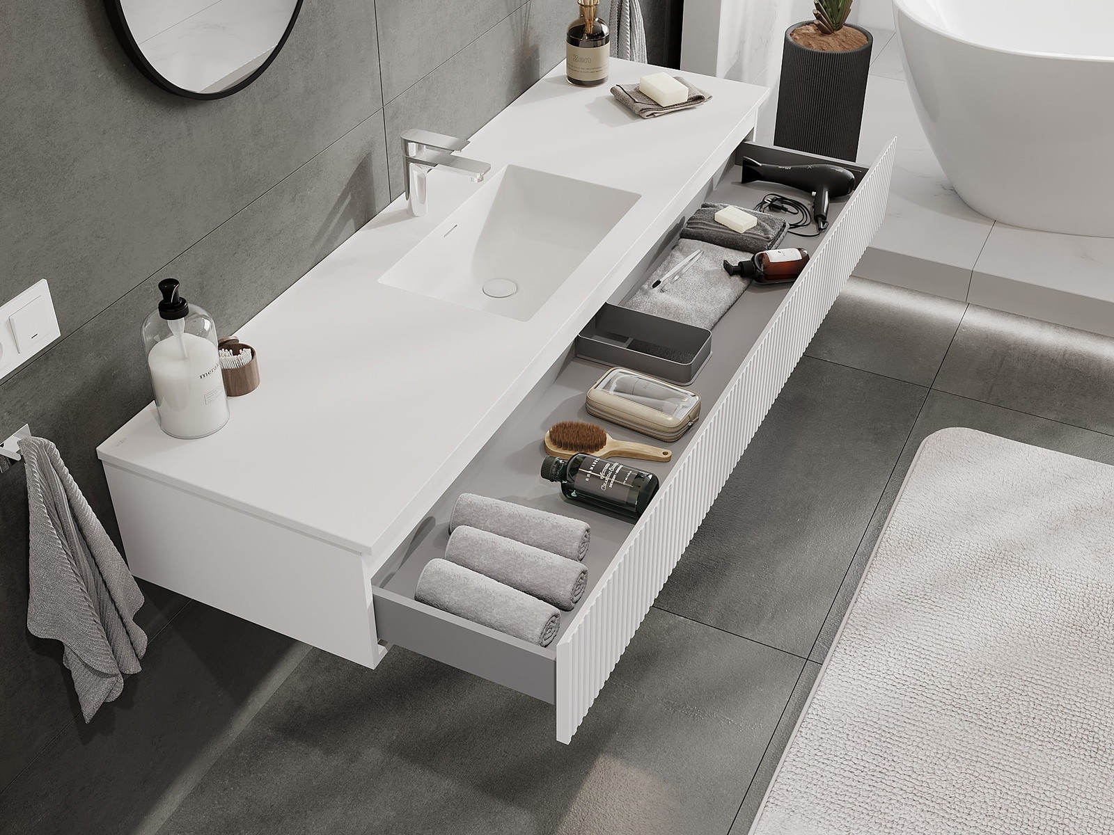 Izgriezums atvilktnē ir veidots tā, lai tajā varētu ietilpt sifons, kas ir nepieciešams izlietņu uzstādīšanā. Pateicoties tam, mēbele var tikt pilnībā funkcionāli uzstādīta, neatstājot ievērojamu vietu atvilktnē instalācijai.