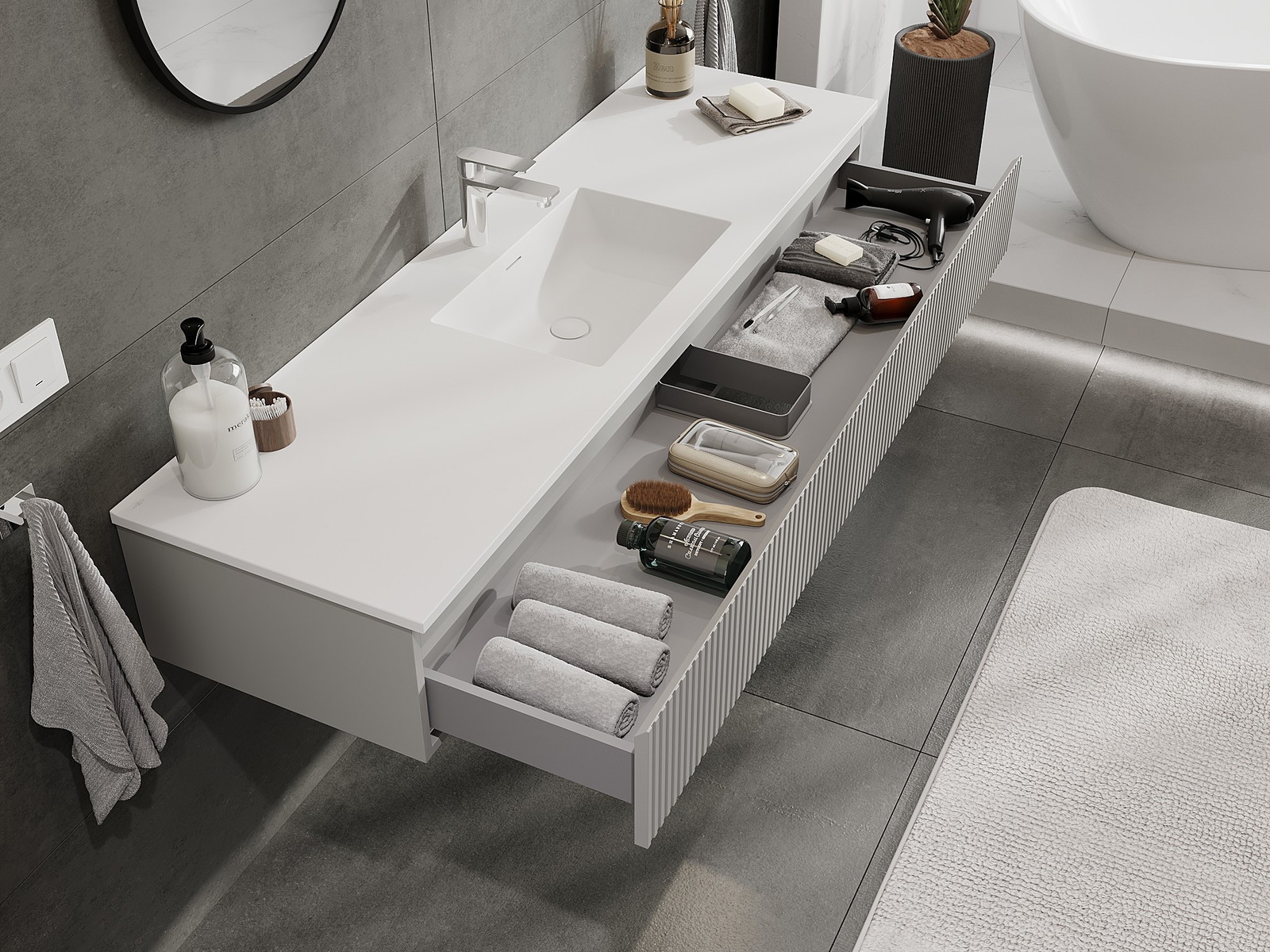 Mexen Rivel vannas istabas skapītis 160 cm ar izlietni Otis, 1 atvilktne, rievots, pelēks mats/balts mats