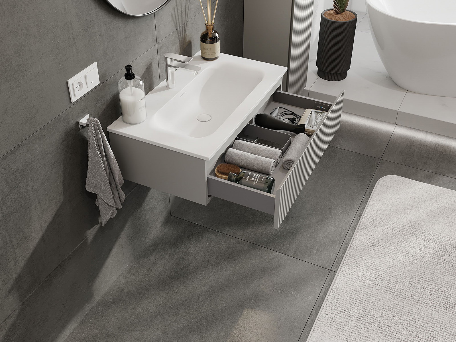 Izgriezums atvilktnē ir veidots tā, lai tajā varētu ietilpt sifons, kas ir nepieciešams izlietņu uzstādīšanā. Pateicoties tam, mēbele var tikt pilnībā funkcionāli uzstādīta, neatstājot ievērojamu vietu atvilktnē instalācijai.