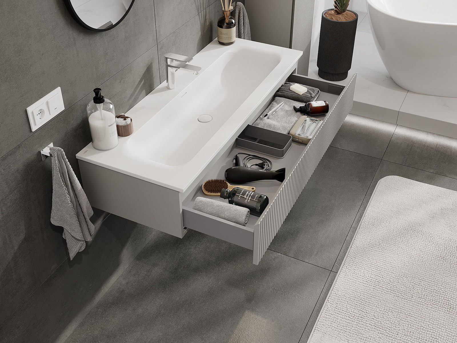 Izgriezums atvilktnē ir veidots tā, lai tajā varētu ietilpt sifons, kas ir nepieciešams izlietņu uzstādīšanā. Pateicoties tam, mēbele var tikt pilnībā funkcionāli uzstādīta, neatstājot ievērojamu vietu atvilktnē instalācijai.