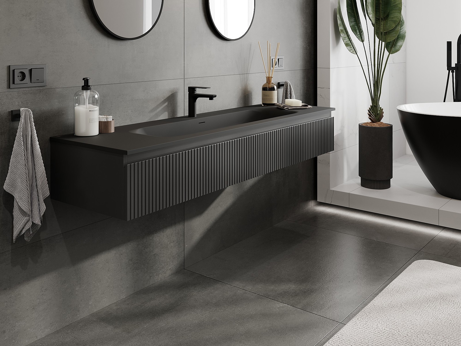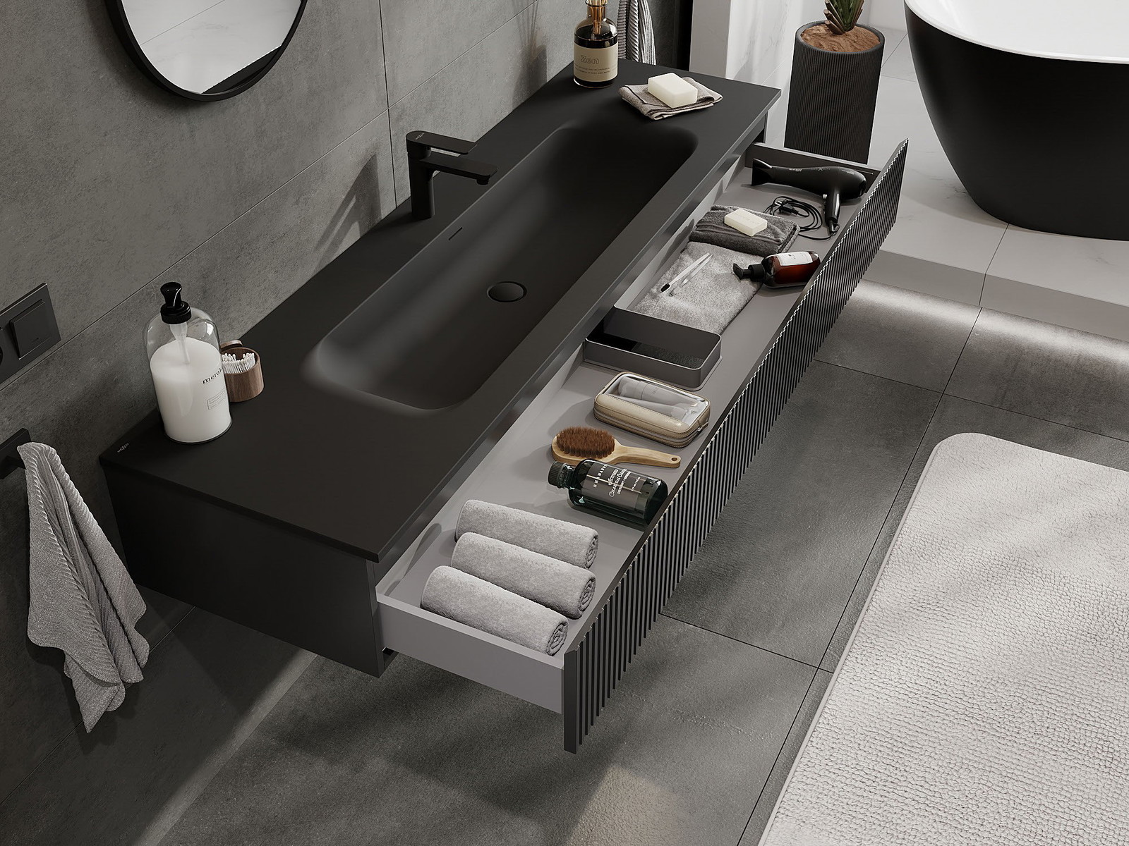 Mexen Rivel 160 cm vannas istabas skapis ar izlietni Vela, 1 atvilktne, rievots, melns matēts - 91A20-16023-1-BF71-W23M71