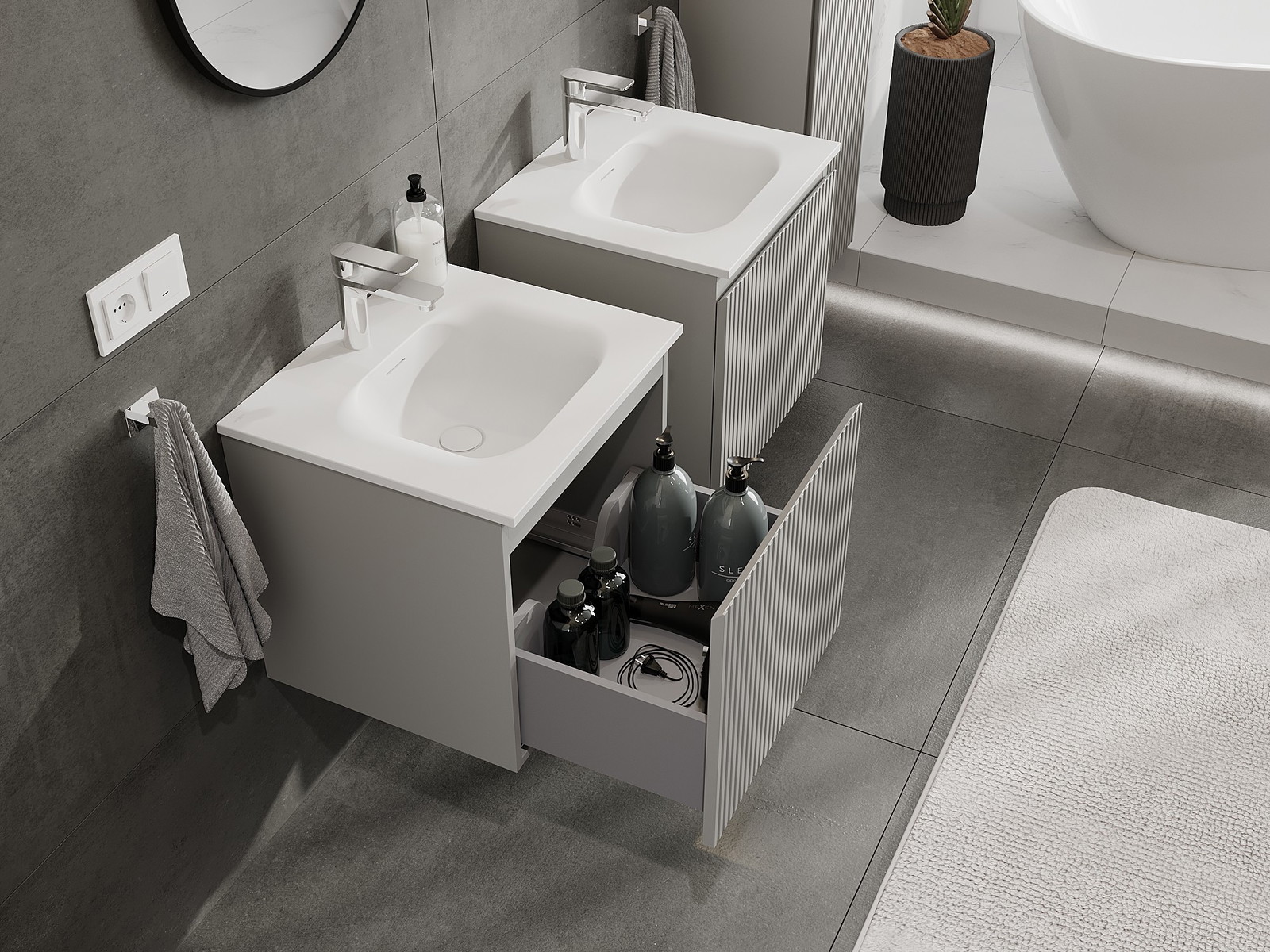 Mūsu modulārās vannas istabas mēbeles var savstarpēji kombinēt dažādās krāsu konfigurācijās, ļaujot pilnīgu personalizāciju. Var izvēlēties gan izskatu, gan atsevišķu elementu funkcijas, kas ļauj pielāgot mēbeles savām stilistiskajām un lietotāju vēlmēm.