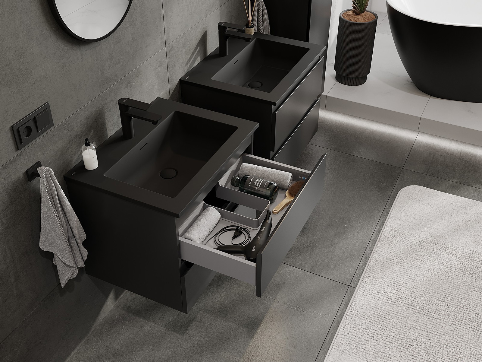 Mexen Orio vannas istabas skapītis 60 cm ar izlietni Otis, 2 atvilktnes, melns matēts - 91A10-06047-2-BFF71-W18M71