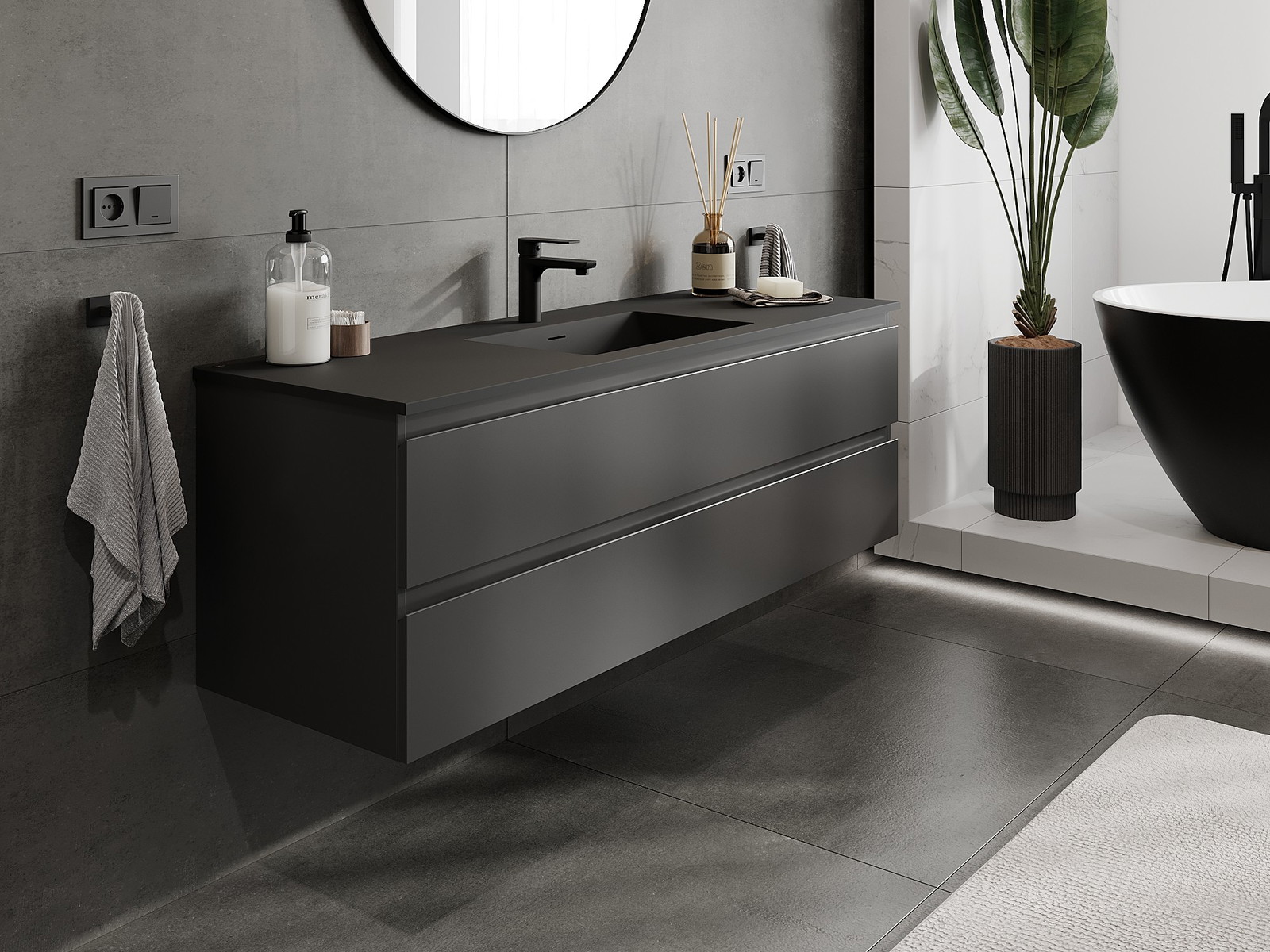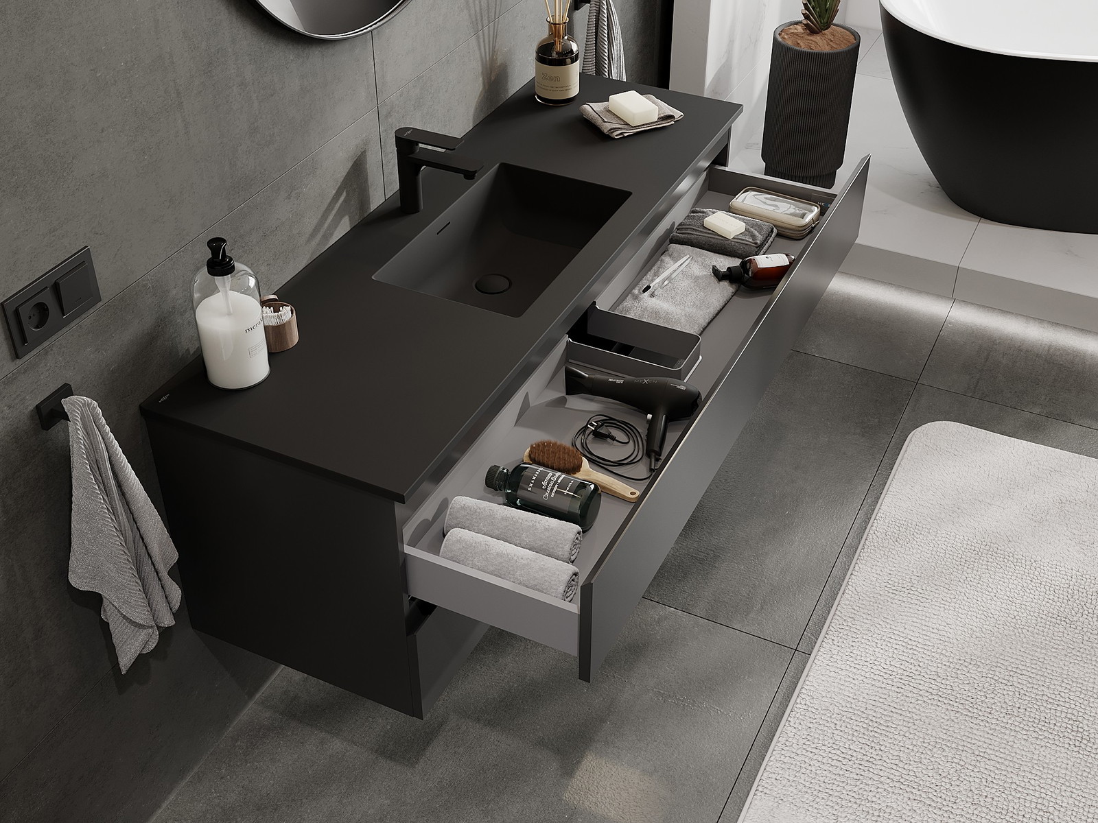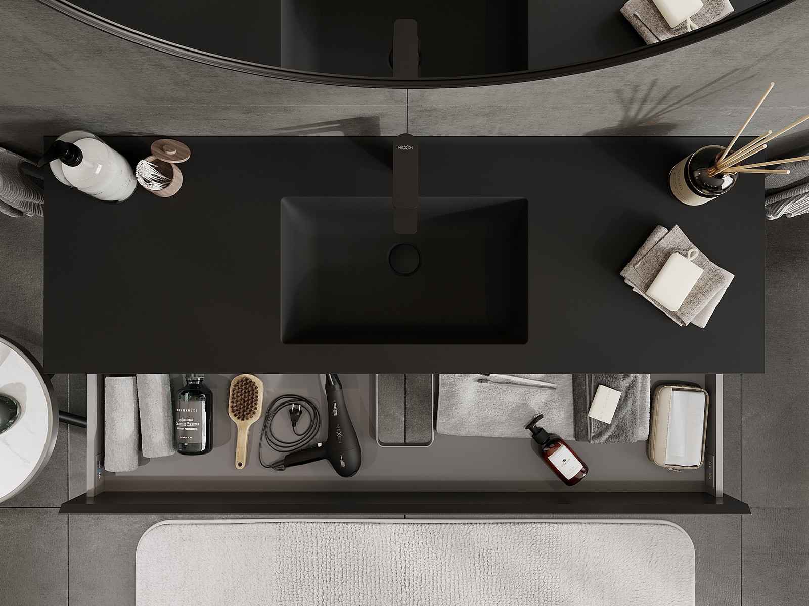 Mexen Orio vannas istabas skapis 140 cm ar izlietni Otis, 2 atvilktnes, melns matēts - 91A10-14047-2-BFF71-W18M71