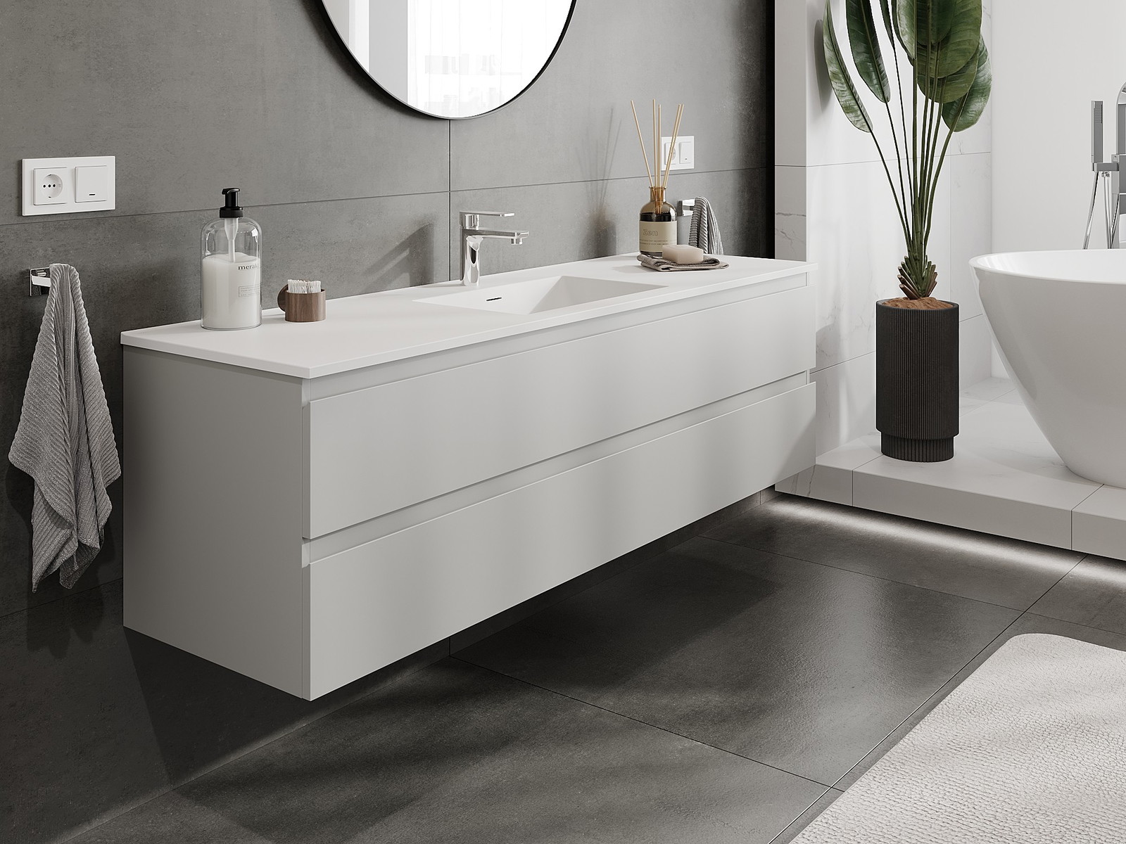 Mexen Orio 160 cm vannas istabas skapītis ar izlietni Otis, 2 atvilktnes, pelēks mats/balts mats - 91A10-16047-2-BFF62-W18M01