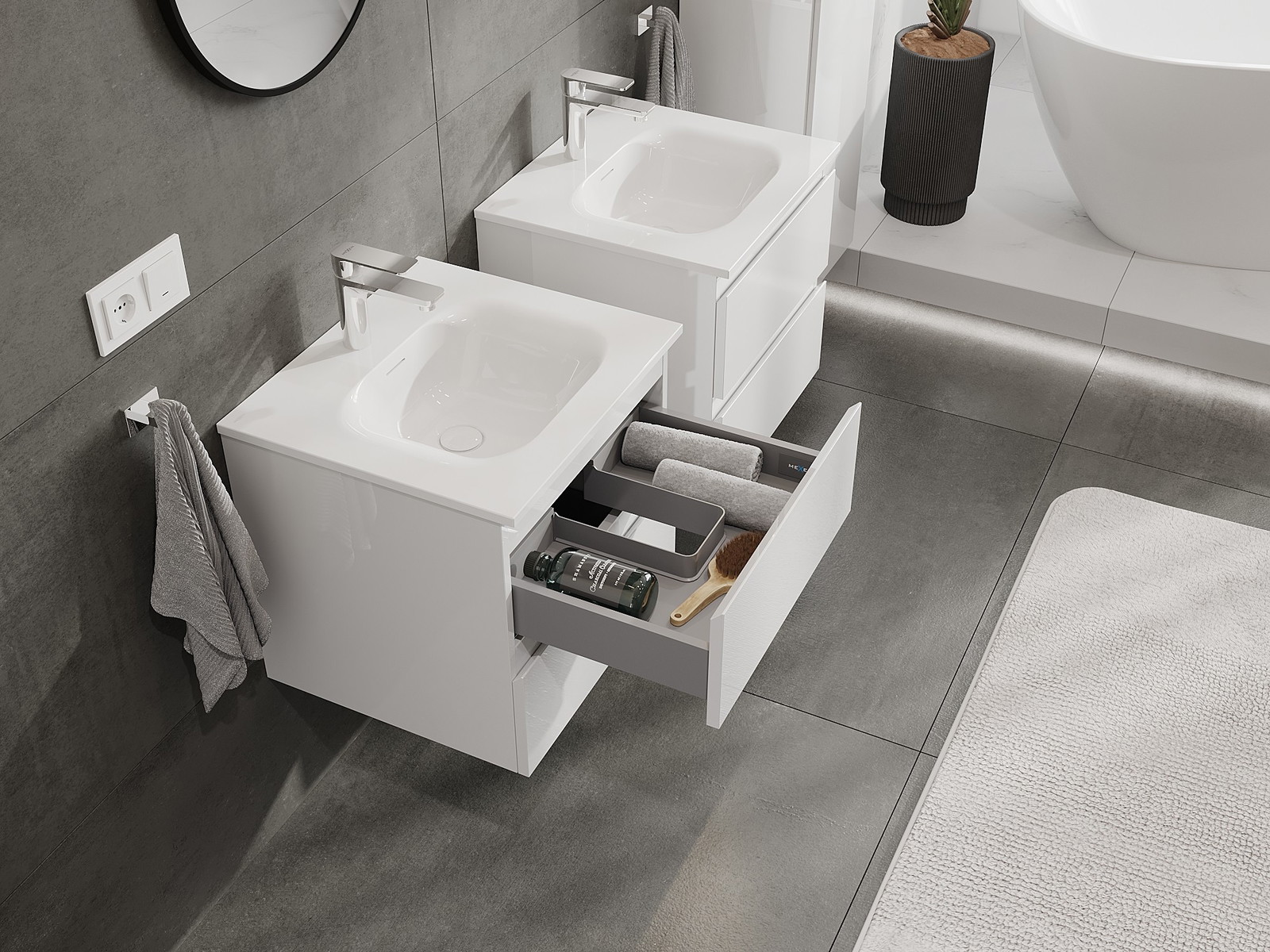 Mūsu modulārās vannas istabas mēbeles var savstarpēji kombinēt dažādās krāsu konfigurācijās, ļaujot pilnīgu personalizāciju. Var izvēlēties gan izskatu, gan atsevišķu elementu funkcijas, kas ļauj pielāgot mēbeles savām stilistiskajām un lietotāju vēlmēm.