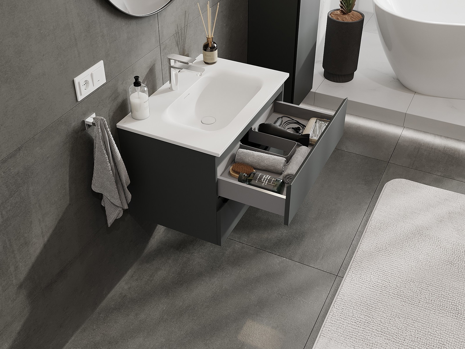 Izgriezums atvilktnē ir veidots tā, lai tajā varētu ietilpt sifons, kas ir nepieciešams izlietņu uzstādīšanā. Pateicoties tam, mēbele var tikt pilnībā funkcionāli uzstādīta, neatstājot ievērojamu vietu atvilktnē instalācijai.