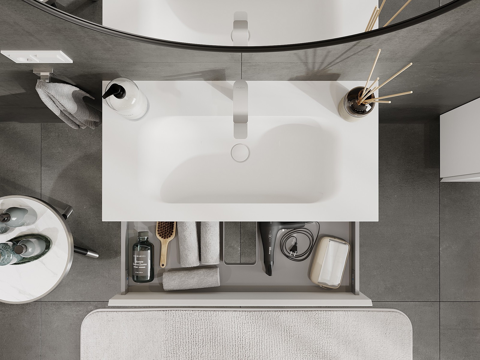 Izgriezums atvilktnē ir veidots tā, lai tajā varētu ietilpt sifons, kas ir nepieciešams izlietņu uzstādīšanā. Pateicoties tam, mēbele var tikt pilnībā funkcionāli uzstādīta, neatstājot ievērojamu vietu atvilktnē instalācijai.